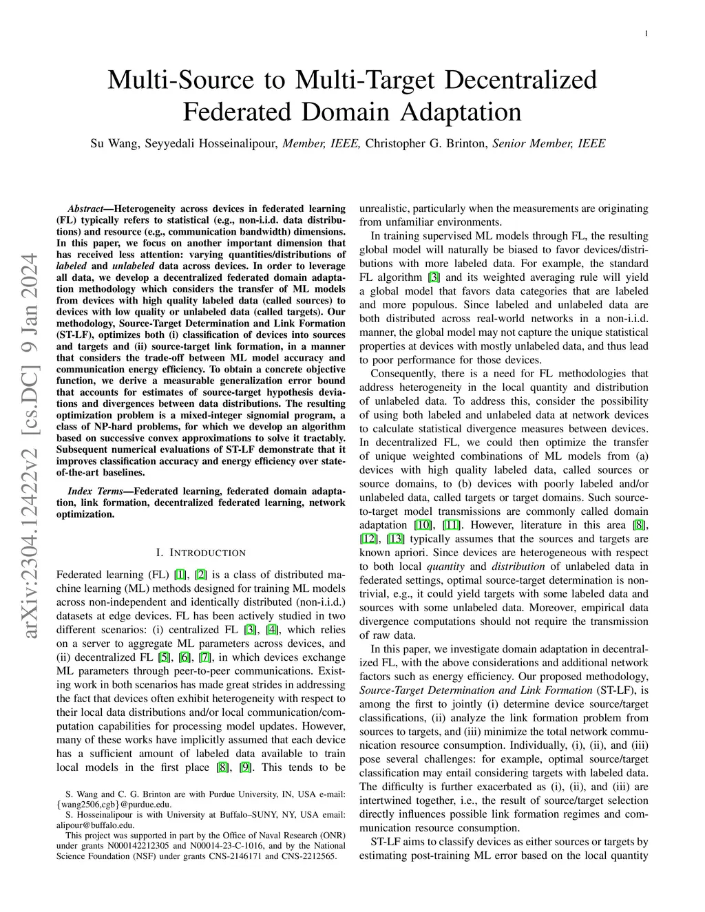 Heterogeneity across devices in federated learning (FL) typically refers to statistical (e.g., non-i.i.d. data distributions) and resource (e.g., communication bandwidth) dimensions. In this paper, we focus on another important dimension that has received less attention: varying quantities/distributions of labeled and unlabeled data across devices. In order to leverage all data, we develop a decentralized federated domain adaptation methodology which considers the transfer of ML models from devices with high quality labeled data (called sources) to devices with low quality or unlabeled data (called targets). Our methodology, Source-Target Determination and Link Formation (ST-LF), optimizes both (i) classification of devices into sources and targets and (ii) source-target link formation, in a manner that considers the trade-off between ML model accuracy and communication energy efficiency. To obtain a concrete objective function, we derive a measurable generalization error bound that accounts for estimates of source-target hypothesis deviations and divergences between data distributions. The resulting optimization problem is a mixed-integer signomial program, a class of NP-hard problems, for which we develop an algorithm based on successive convex approximations to solve it tractably. Subsequent numerical evaluations of ST-LF demonstrate that it improves classification accuracy and energy efficiency over state-of-the-art baselines.