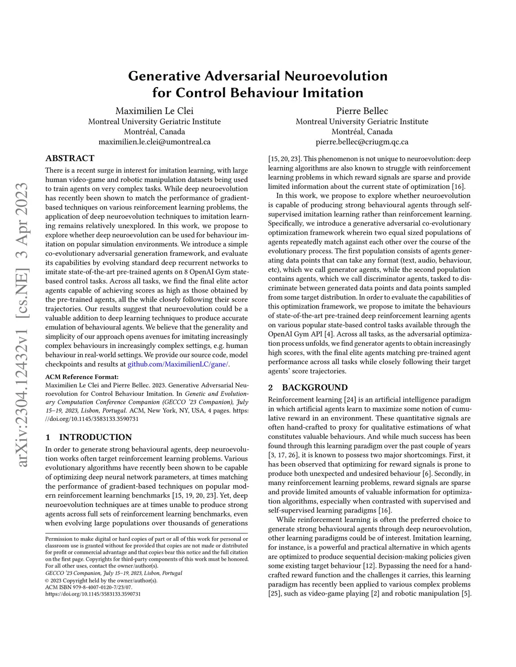 There is a recent surge in interest for imitation learning, with large human video-game and robotic manipulation datasets being used to train agents on very complex tasks. While deep neuroevolution has recently been shown to match the performance of gradient-based techniques on various reinforcement learning problems, the application of deep neuroevolution techniques to imitation learning remains relatively unexplored. In this work, we propose to explore whether deep neuroevolution can be used for behaviour imitation on popular simulation environments. We introduce a simple co-evolutionary adversarial generation framework, and evaluate its capabilities by evolving standard deep recurrent networks to imitate state-of-the-art pre-trained agents on 8 OpenAI Gym state-based control tasks. Across all tasks, we find the final elite actor agents capable of achieving scores as high as those obtained by the pre-trained agents, all the while closely following their score trajectories. Our results suggest that neuroevolution could be a valuable addition to deep learning techniques to produce accurate emulation of behavioural agents. We believe that the generality and simplicity of our approach opens avenues for imitating increasingly complex behaviours in increasingly complex settings, e.g. human behaviour in real-world settings. We provide our source code, model checkpoints and results at github.com/MaximilienLC/gane.