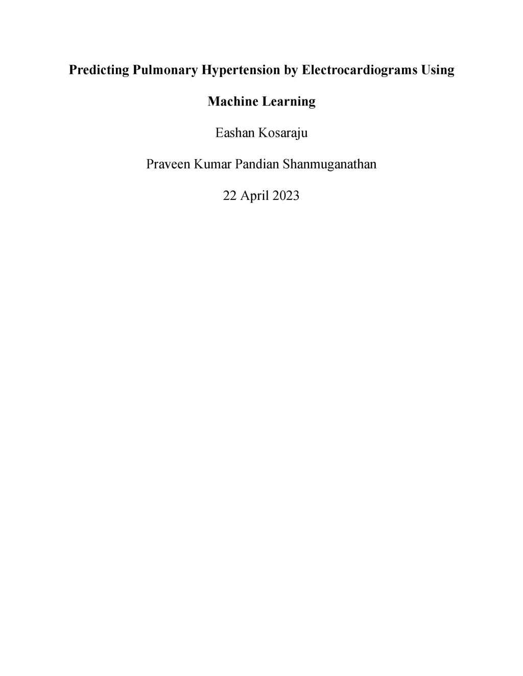 Pulmonary hypertension (PH) is a condition of high blood pressure that affects the arteries in the lungs and the right side of the heart (Mayo Clinic, 2017). A mean pulmonary artery pressure greater than 25 mmHg is defined as Pulmonary hypertension. The estimated 5-year survival rate from the time of diagnosis of pulmonary hypertension is only 57% without therapy and patients with right heart failure only survive for approximately 1 year without treatment (Benza et al., 2012). Given the indolent nature of the disease, early detection of PH remains a challenge leading to delays in therapy. Echocardiography is currently used as a screening tool for diagnosing PH. However, electrocardiography (ECG), a more accessible, simple to use, and cost-effective tool compared to echocardiography, is less studied and explored for screening at-risk patients for PH. The goal of this project is to create a neural network model which can process an ECG signal and detect the presence of PH with a confidence probability. I created a dense neural network (DNN) model that has an accuracy of 98% over the available training sample. For future steps, the current model will be updated with a model suited for time-series data. To balance the dataset with proper training samples, I will generate additional data using data augmentation techniques. Through early and accurate detection of conditions such as PH, we widen the spectrum of innovation in detecting chronic life-threatening health conditions and reduce associated mortality and morbidity.
