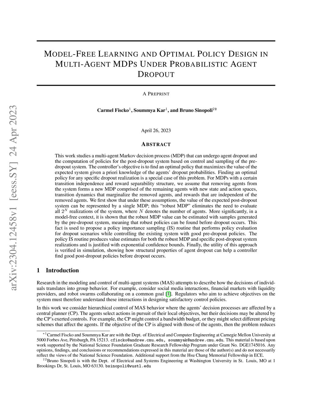 This work studies a multi-agent Markov decision process (MDP) that can undergo agent dropout and the computation of policies for the post-dropout system based on control and sampling of the pre-dropout system. The controller's objective is to find an optimal policy that maximizes the value of the expected system given a priori knowledge of the agents' dropout probabilities. Finding an optimal policy for any specific dropout realization is a special case of this problem. For MDPs with a certain transition independence and reward separability structure, we assume that removing agents from the system forms a new MDP comprised of the remaining agents with new state and action spaces, transition dynamics that marginalize the removed agents, and rewards that are independent of the removed agents. We first show that under these assumptions, the value of the expected post-dropout system can be represented by a single MDP; this "robust MDP" eliminates the need to evaluate all realizations of the system, where denotes the number of agents. More significantly, in a model-free context, it is shown that the robust MDP value can be estimated with samples generated by the pre-dropout system, meaning that robust policies can be found before dropout occurs. This fact is used to propose a policy importance sampling (IS) routine that performs policy evaluation for dropout scenarios while controlling the existing system with good pre-dropout policies. The policy IS routine produces value estimates for both the robust MDP and specific post-dropout system realizations and is justified with exponential confidence bounds. Finally, the utility of this approach is verified in simulation, showing how structural properties of agent dropout can help a controller find good post-dropout policies before dropout occurs.