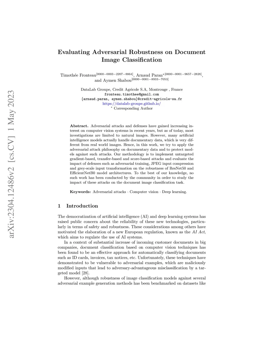 Adversarial attacks and defenses have gained increasing interest on computer vision systems in recent years, but as of today, most investigations are limited to images. However, many artificial intelligence models actually handle documentary data, which is very different from real world images. Hence, in this work, we try to apply the adversarial attack philosophy on documentary and natural data and to protect models against such attacks. We focus our work on untargeted gradient-based, transfer-based and score-based attacks and evaluate the impact of adversarial training, JPEG input compression and grey-scale input transformation on the robustness of ResNet50 and EfficientNetB0 model architectures. To the best of our knowledge, no such work has been conducted by the community in order to study the impact of these attacks on the document image classification task.
