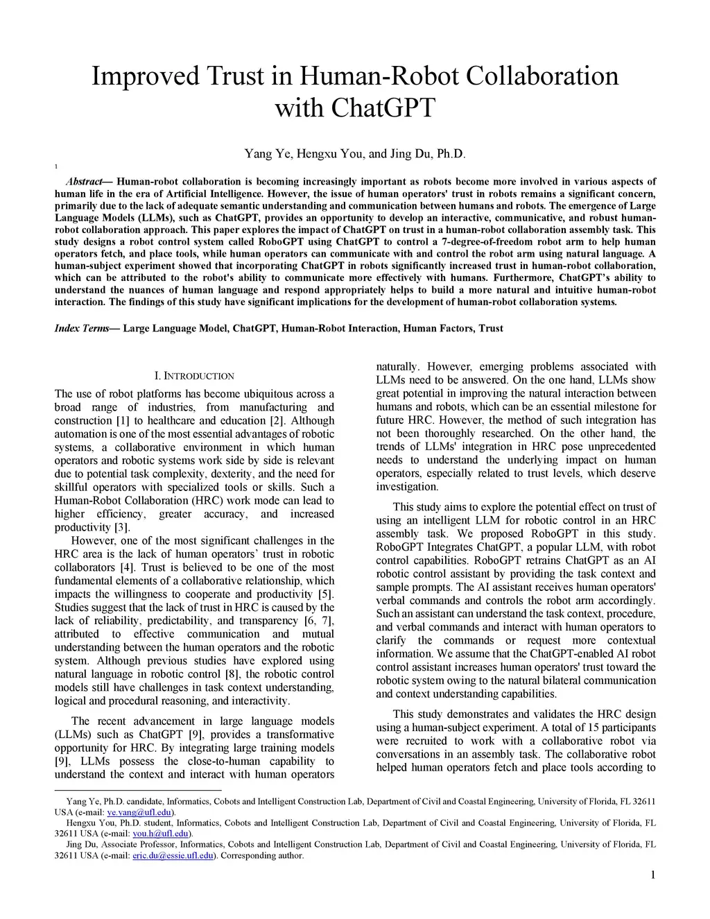 Improved Trust in Human-Robot Collaboration with ChatGPT