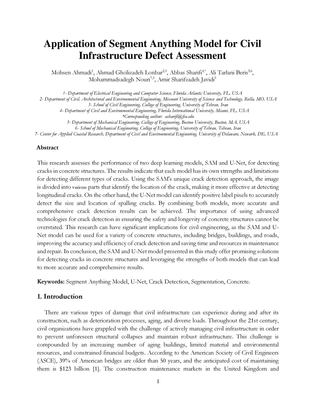 This research assesses the performance of two deep learning models, SAM and U-Net, for detecting cracks in concrete structures. The results indicate that each model has its own strengths and limitations for detecting different types of cracks. Using the SAM's unique crack detection approach, the image is divided into various parts that identify the location of the crack, making it more effective at detecting longitudinal cracks. On the other hand, the U-Net model can identify positive label pixels to accurately detect the size and location of spalling cracks. By combining both models, more accurate and comprehensive crack detection results can be achieved. The importance of using advanced technologies for crack detection in ensuring the safety and longevity of concrete structures cannot be overstated. This research can have significant implications for civil engineering, as the SAM and U-Net model can be used for a variety of concrete structures, including bridges, buildings, and roads, improving the accuracy and efficiency of crack detection and saving time and resources in maintenance and repair. In conclusion, the SAM and U-Net model presented in this study offer promising solutions for detecting cracks in concrete structures and leveraging the strengths of both models that can lead to more accurate and comprehensive results.