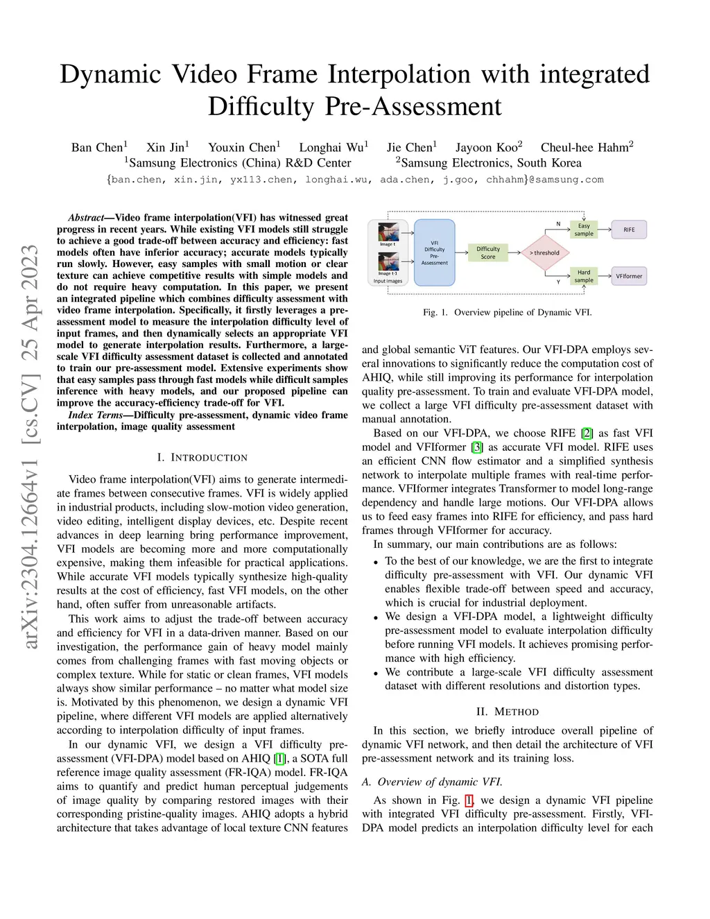 Video frame interpolation(VFI) has witnessed great progress in recent years. While existing VFI models still struggle to achieve a good trade-off between accuracy and efficiency: fast models often have inferior accuracy; accurate models typically run slowly. However, easy samples with small motion or clear texture can achieve competitive results with simple models and do not require heavy computation. In this paper, we present an integrated pipeline which combines difficulty assessment with video frame interpolation. Specifically, it firstly leverages a pre-assessment model to measure the interpolation difficulty level of input frames, and then dynamically selects an appropriate VFI model to generate interpolation results. Furthermore, a large-scale VFI difficulty assessment dataset is collected and annotated to train our pre-assessment model. Extensive experiments show that easy samples pass through fast models while difficult samples inference with heavy models, and our proposed pipeline can improve the accuracy-efficiency trade-off for VFI.