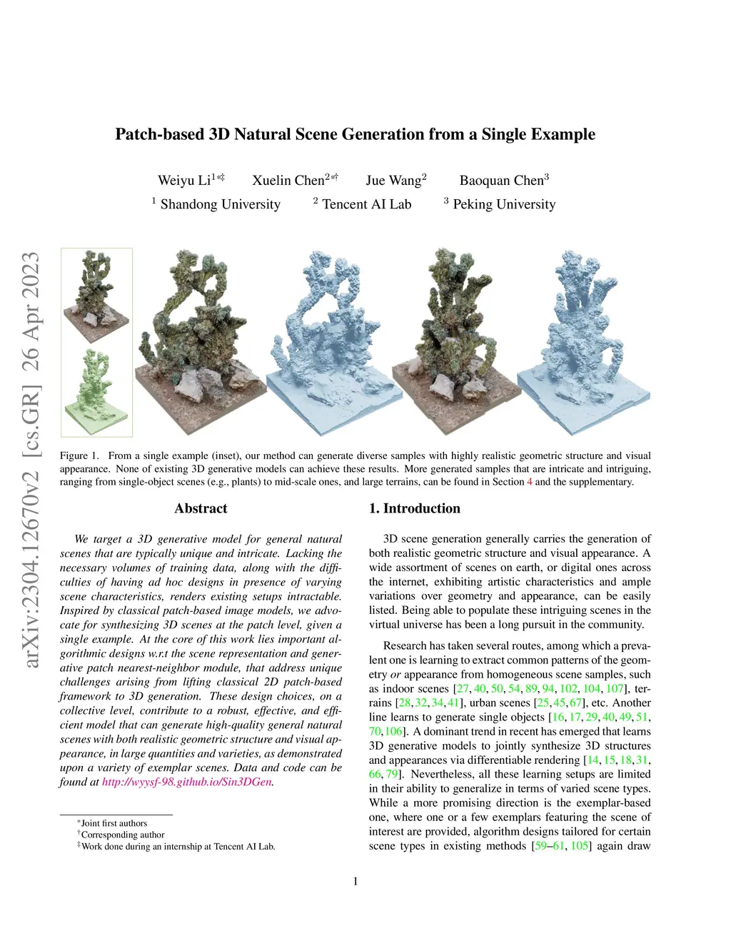 We target a 3D generative model for general natural scenes that are typically unique and intricate. Lacking the necessary volumes of training data, along with the difficulties of having ad hoc designs in presence of varying scene characteristics, renders existing setups intractable. Inspired by classical patch-based image models, we advocate for synthesizing 3D scenes at the patch level, given a single example. At the core of this work lies important algorithmic designs w.r.t the scene representation and generative patch nearest-neighbor module, that address unique challenges arising from lifting classical 2D patch-based framework to 3D generation. These design choices, on a collective level, contribute to a robust, effective, and efficient model that can generate high-quality general natural scenes with both realistic geometric structure and visual appearance, in large quantities and varieties, as demonstrated upon a variety of exemplar scenes.
