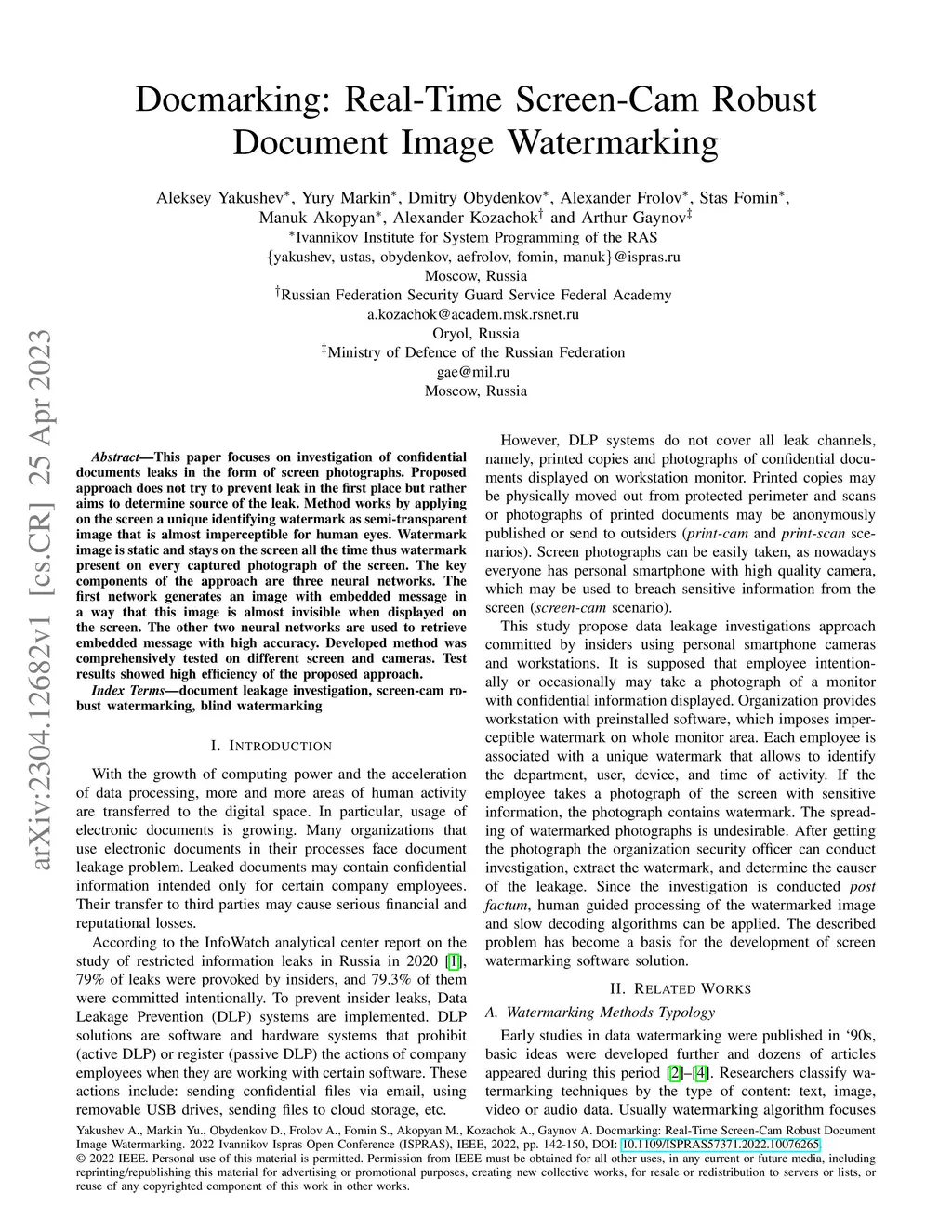 This paper focuses on investigation of confidential documents leaks in the form of screen photographs. Proposed approach does not try to prevent leak in the first place but rather aims to determine source of the leak. Method works by applying on the screen a unique identifying watermark as semi-transparent image that is almost imperceptible for human eyes. Watermark image is static and stays on the screen all the time thus watermark present on every captured photograph of the screen. The key components of the approach are three neural networks. The first network generates an image with embedded message in a way that this image is almost invisible when displayed on the screen. The other two neural networks are used to retrieve embedded message with high accuracy. Developed method was comprehensively tested on different screen and cameras. Test results showed high efficiency of the proposed approach.