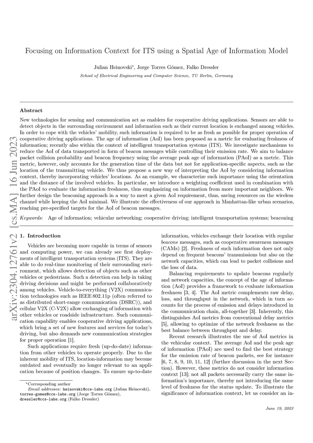 New technologies for sensing and communication act as enablers for cooperative driving applications. Sensors are able to detect objects in the surrounding environment and information such as their current location is exchanged among vehicles. In order to cope with the vehicles' mobility, such information is required to be as fresh as possible for proper operation of cooperative driving applications. The age of information (AoI) has been proposed as a metric for evaluating freshness of information; recently also within the context of intelligent transportation systems (ITS). We investigate mechanisms to reduce the AoI of data transported in form of beacon messages while controlling their emission rate. We aim to balance packet collision probability and beacon frequency using the average peak age of information (PAoI) as a metric. This metric, however, only accounts for the generation time of the data but not for application-specific aspects, such as the location of the transmitting vehicle. We thus propose a new way of interpreting the AoI by considering information context, thereby incorporating vehicles' locations. As an example, we characterize such importance using the orientation and the distance of the involved vehicles. In particular, we introduce a weighting coefficient used in combination with the PAoI to evaluate the information freshness, thus emphasizing on information from more important neighbors. We further design the beaconing approach in a way to meet a given AoI requirement, thus, saving resources on the wireless channel while keeping the AoI minimal. We illustrate the effectiveness of our approach in Manhattan-like urban scenarios, reaching pre-specified targets for the AoI of beacon messages.