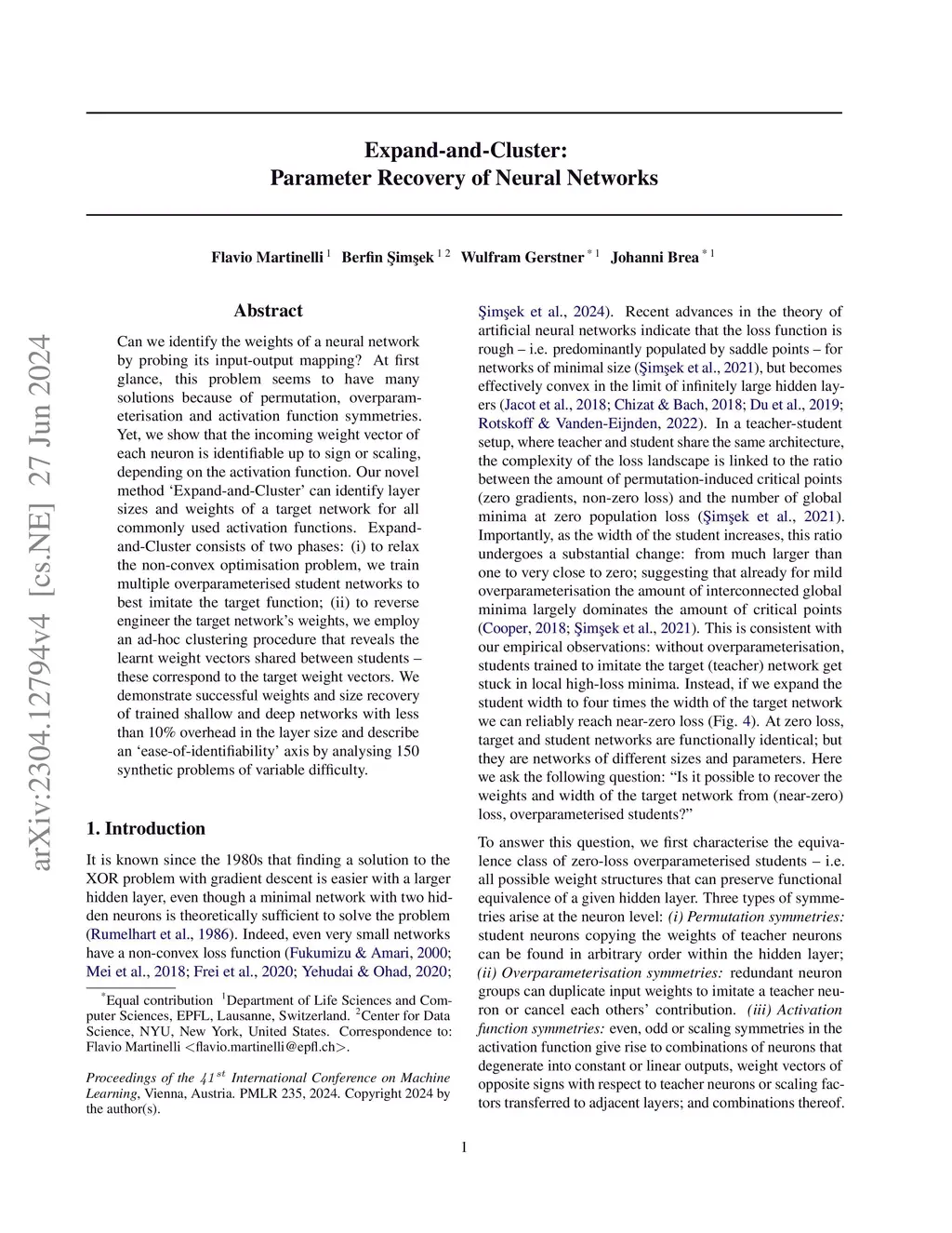 Can we identify the weights of a neural network by probing its input-output mapping? At first glance, this problem seems to have many solutions because of permutation, overparameterisation and activation function symmetries. Yet, we show that the incoming weight vector of each neuron is identifiable up to sign or scaling, depending on the activation function. Our novel method Éxpand-and-Cluster' can identify layer sizes and weights of a target network for all commonly used activation functions. Expand-and-Cluster consists of two phases: (i) to relax the non-convex optimisation problem, we train multiple overparameterised student networks to best imitate the target function; (ii) to reverse engineer the target network's weights, we employ an ad-hoc clustering procedure that reveals the learnt weight vectors shared between students -- these correspond to the target weight vectors. We demonstrate successful weights and size recovery of trained shallow and deep networks with less than 10\% overhead in the layer size and describe an `ease-of-identifiability' axis by analysing 150 synthetic problems of variable difficulty.