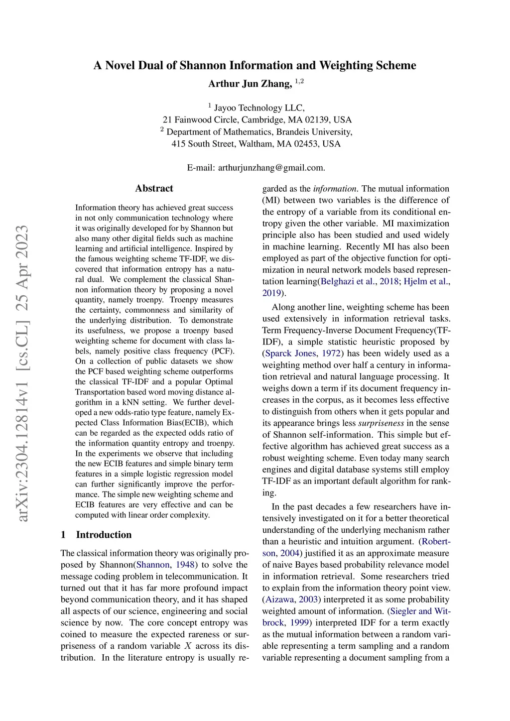 Shannon Information theory has achieved great success in not only communication technology where it was originally developed for but also many other science and engineering fields such as machine learning and artificial intelligence. Inspired by the famous weighting scheme TF-IDF, we discovered that information entropy has a natural dual. We complement the classical Shannon information theory by proposing a novel quantity, namely troenpy. Troenpy measures the certainty, commonness and similarity of the underlying distribution. To demonstrate its usefulness, we propose a troenpy based weighting scheme for document with class labels, namely positive class frequency (PCF). On a collection of public datasets we show the PCF based weighting scheme outperforms the classical TF-IDF and a popular Optimal Transportation based word moving distance algorithm in a kNN setting. We further developed a new odds-ratio type feature, namely Expected Class Information Bias(ECIB), which can be regarded as the expected odds ratio of the information quantity entropy and troenpy. In the experiments we observe that including the new ECIB features and simple binary term features in a simple logistic regression model can further significantly improve the performance. The simple new weighting scheme and ECIB features are very effective and can be computed with linear order complexity.