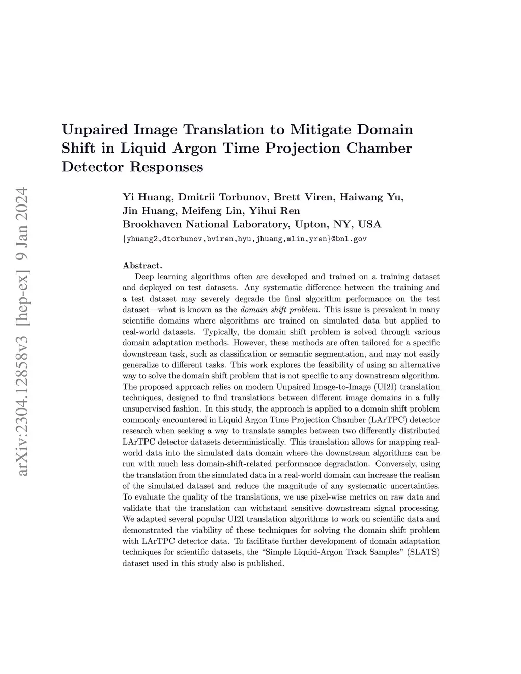 Deep learning algorithms often are trained and deployed on different datasets. Any systematic difference between the training and a test dataset may degrade the algorithm performance--what is known as the domain shift problem. This issue is prevalent in many scientific domains where algorithms are trained on simulated data but applied to real-world datasets. Typically, the domain shift problem is solved through various domain adaptation methods. However, these methods are often tailored for a specific downstream task and may not easily generalize to different tasks. This work explores the feasibility of using an alternative way to solve the domain shift problem that is not specific to any downstream algorithm. The proposed approach relies on modern Unpaired Image-to-Image translation techniques, designed to find translations between different image domains in a fully unsupervised fashion. In this study, the approach is applied to a domain shift problem commonly encountered in Liquid Argon Time Projection Chamber (LArTPC) detector research when seeking a way to translate samples between two differently distributed detector datasets deterministically. This translation allows for mapping real-world data into the simulated data domain where the downstream algorithms can be run with much less domain-shift-related degradation. Conversely, using the translation from the simulated data in a real-world domain can increase the realism of the simulated dataset and reduce the magnitude of any systematic uncertainties. We adapted several UI2I translation algorithms to work on scientific data and demonstrated the viability of these techniques for solving the domain shift problem with LArTPC detector data. To facilitate further development of domain adaptation techniques for scientific datasets, the "Simple Liquid-Argon Track Samples" dataset used in this study also is published.