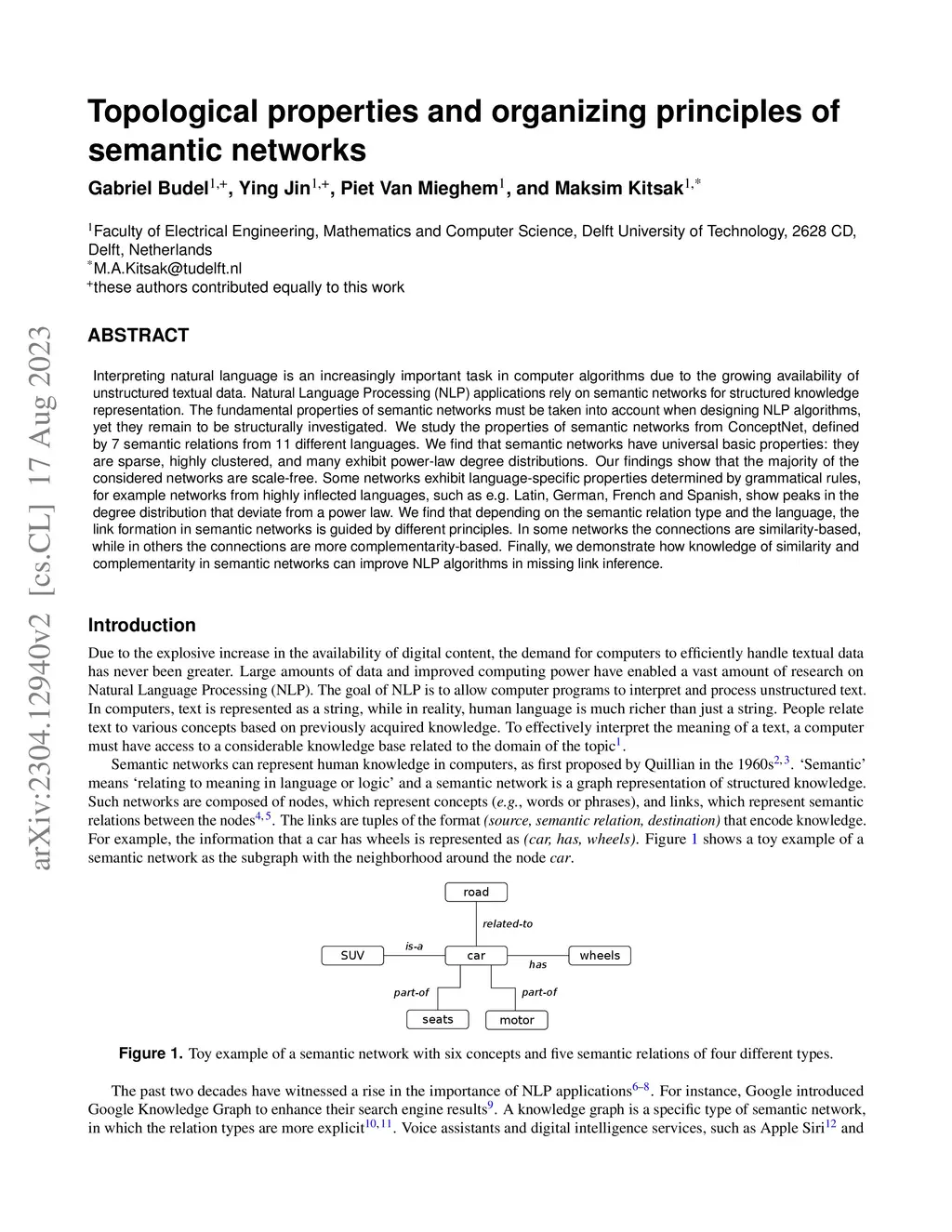 Interpreting natural language is an increasingly important task in computer algorithms due to the growing availability of unstructured textual data. Natural Language Processing (NLP) applications rely on semantic networks for structured knowledge representation. The fundamental properties of semantic networks must be taken into account when designing NLP algorithms, yet they remain to be structurally investigated. We study the properties of semantic networks from ConceptNet, defined by 7 semantic relations from 11 different languages. We find that semantic networks have universal basic properties: they are sparse, highly clustered, and many exhibit power-law degree distributions. Our findings show that the majority of the considered networks are scale-free. Some networks exhibit language-specific properties determined by grammatical rules, for example networks from highly inflected languages, such as e.g. Latin, German, French and Spanish, show peaks in the degree distribution that deviate from a power law. We find that depending on the semantic relation type and the language, the link formation in semantic networks is guided by different principles. In some networks the connections are similarity-based, while in others the connections are more complementarity-based. Finally, we demonstrate how knowledge of similarity and complementarity in semantic networks can improve NLP algorithms in missing link inference.