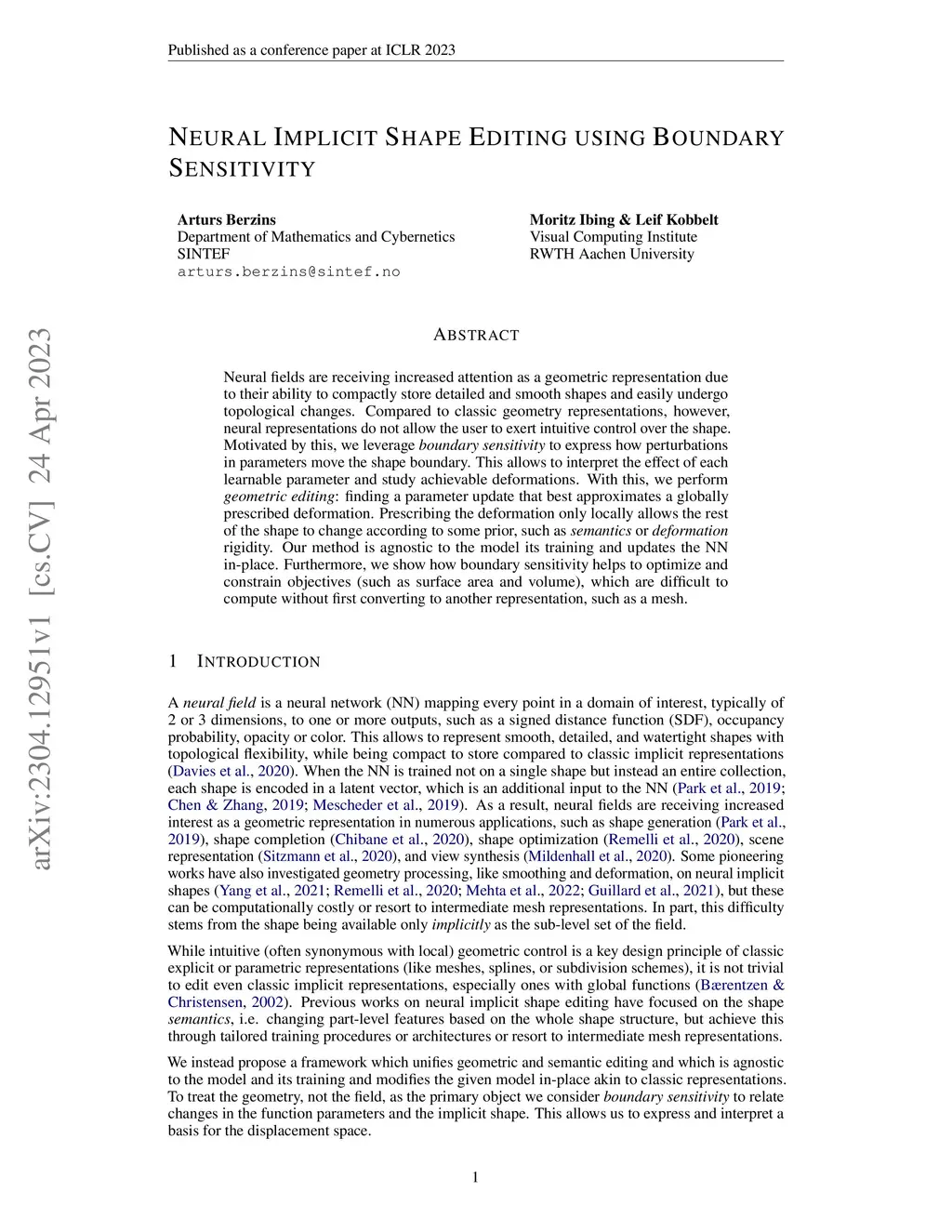 Neural Implicit Shape Editing using Boundary Sensitivity