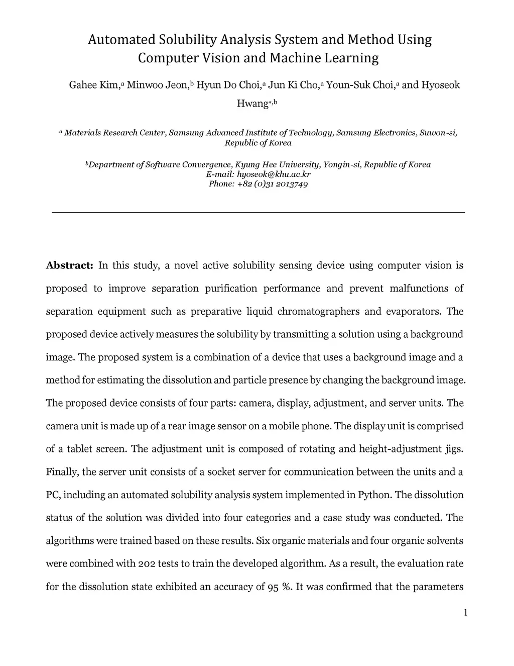 In this study, a novel active solubility sensing device using computer vision is proposed to improve separation purification performance and prevent malfunctions of separation equipment such as preparative liquid chromatographers and evaporators. The proposed device actively measures the solubility by transmitting a solution using a background image. The proposed system is a combination of a device that uses a background image and a method for estimating the dissolution and particle presence by changing the background image. The proposed device consists of four parts: camera, display, adjustment, and server units. The camera unit is made up of a rear image sensor on a mobile phone. The display unit is comprised of a tablet screen. The adjustment unit is composed of rotating and height-adjustment jigs. Finally, the server unit consists of a socket server for communication between the units and a PC, including an automated solubility analysis system implemented in Python. The dissolution status of the solution was divided into four categories and a case study was conducted. The algorithms were trained based on these results. Six organic materials and four organic solvents were combined with 202 tests to train the developed algorithm. As a result, the evaluation rate for the dissolution state exhibited an accuracy of 95 %. In addition, the device and method must develop a feedback function that can add a solvent or solute after dissolution detection using solubility results for use in autonomous systems, such as a synthetic automation system. Finally, the diversification of the sensing method is expected to extend not only to the solution but also to the solubility and homogeneity analysis of the film.