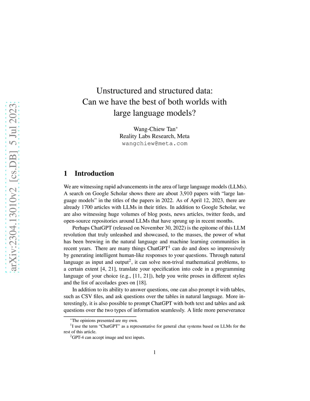 This paper presents an opinion on the potential of using large language models to query on both unstructured and structured data. It also outlines some research challenges related to the topic of building question-answering systems for both types of data.