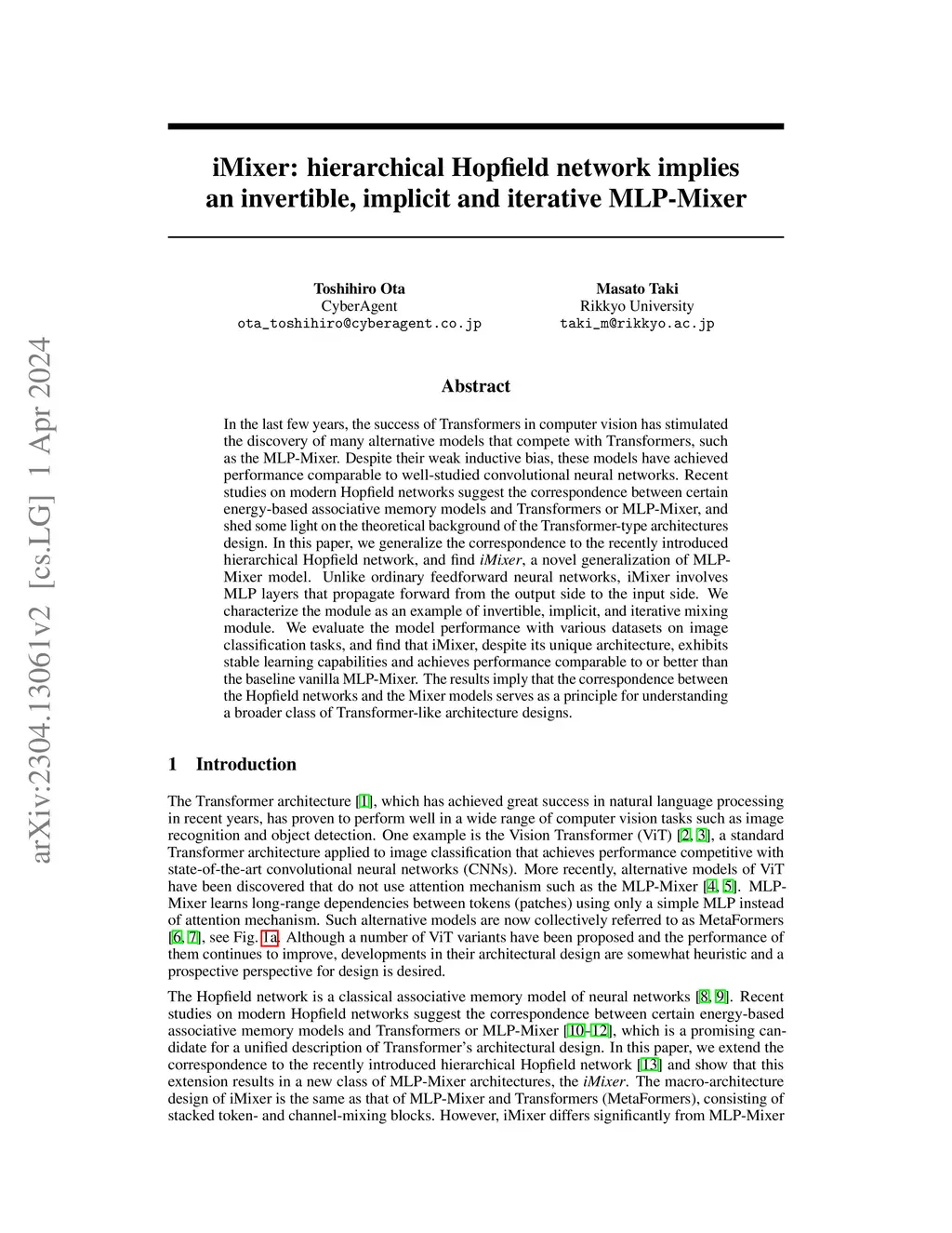 iMixer: hierarchical Hopfield network implies an invertible, implicit