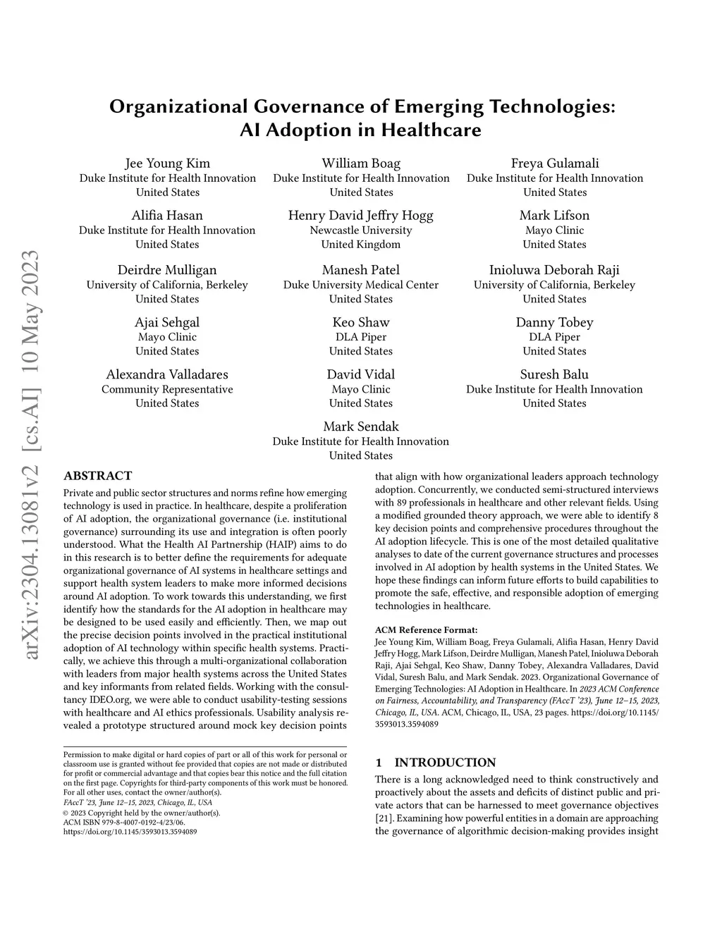 Private and public sector structures and norms refine how emerging technology is used in practice. In healthcare, despite a proliferation of AI adoption, the organizational governance surrounding its use and integration is often poorly understood. What the Health AI Partnership (HAIP) aims to do in this research is to better define the requirements for adequate organizational governance of AI systems in healthcare settings and support health system leaders to make more informed decisions around AI adoption. To work towards this understanding, we first identify how the standards for the AI adoption in healthcare may be designed to be used easily and efficiently. Then, we map out the precise decision points involved in the practical institutional adoption of AI technology within specific health systems. Practically, we achieve this through a multi-organizational collaboration with leaders from major health systems across the United States and key informants from related fields. Working with the consultancy IDEO [dot] org, we were able to conduct usability-testing sessions with healthcare and AI ethics professionals. Usability analysis revealed a prototype structured around mock key decision points that align with how organizational leaders approach technology adoption. Concurrently, we conducted semi-structured interviews with 89 professionals in healthcare and other relevant fields. Using a modified grounded theory approach, we were able to identify 8 key decision points and comprehensive procedures throughout the AI adoption lifecycle. This is one of the most detailed qualitative analyses to date of the current governance structures and processes involved in AI adoption by health systems in the United States. We hope these findings can inform future efforts to build capabilities to promote the safe, effective, and responsible adoption of emerging technologies in healthcare.