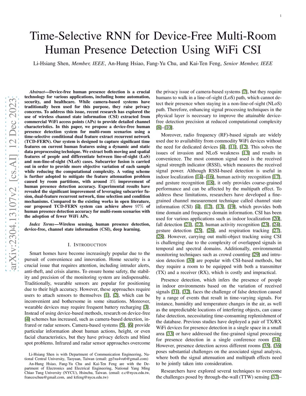 Human presence detection is a crucial technology for various applications, including home automation, security, and healthcare. While camera-based systems have traditionally been used for this purpose, they raise privacy concerns. To address this issue, recent research has explored the use of channel state information (CSI) approaches that can be extracted from commercial WiFi access points (APs) and provide detailed channel characteristics. In this thesis, we propose a device-free human presence detection system for multi-room scenarios using a time-selective conditional dual feature extract recurrent Network (TCD-FERN). Our system is designed to capture significant time features with the condition on current human features using a dynamic and static (DaS) data preprocessing technique to extract moving and spatial features of people and differentiate between line-of-sight (LoS) path blocking and non-blocking cases. To mitigate the feature attenuation problem caused by room partitions, we employ a voting scheme. We conduct evaluation and real-time experiments to demonstrate that our proposed TCD-FERN system can achieve human presence detection for multi-room scenarios using fewer commodity WiFi APs.