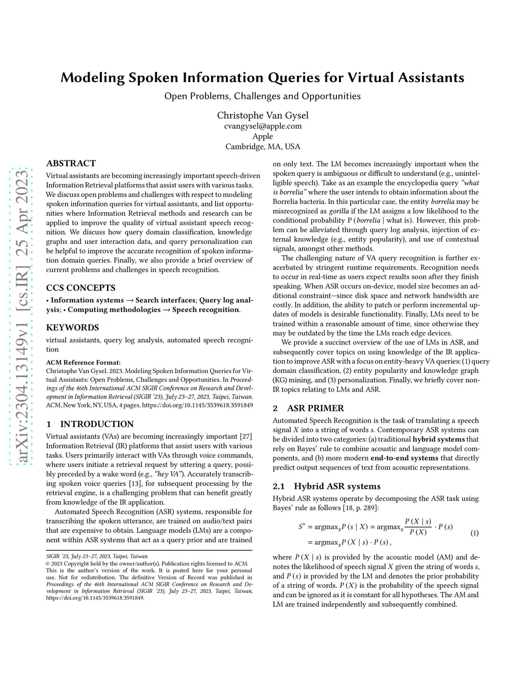 Virtual assistants are becoming increasingly important speech-driven Information Retrieval platforms that assist users with various tasks. We discuss open problems and challenges with respect to modeling spoken information queries for virtual assistants, and list opportunities where Information Retrieval methods and research can be applied to improve the quality of virtual assistant speech recognition. We discuss how query domain classification, knowledge graphs and user interaction data, and query personalization can be helpful to improve the accurate recognition of spoken information domain queries. Finally, we also provide a brief overview of current problems and challenges in speech recognition.