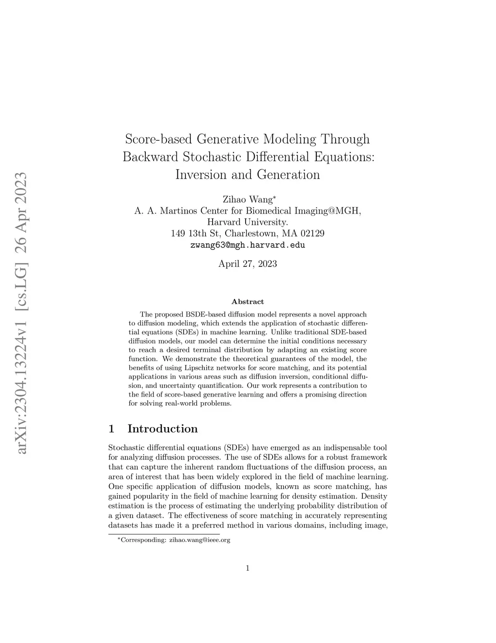 The proposed BSDE-based diffusion model represents a novel approach to diffusion modeling, which extends the application of stochastic differential equations (SDEs) in machine learning. Unlike traditional SDE-based diffusion models, our model can determine the initial conditions necessary to reach a desired terminal distribution by adapting an existing score function. We demonstrate the theoretical guarantees of the model, the benefits of using Lipschitz networks for score matching, and its potential applications in various areas such as diffusion inversion, conditional diffusion, and uncertainty quantification. Our work represents a contribution to the field of score-based generative learning and offers a promising direction for solving real-world problems.