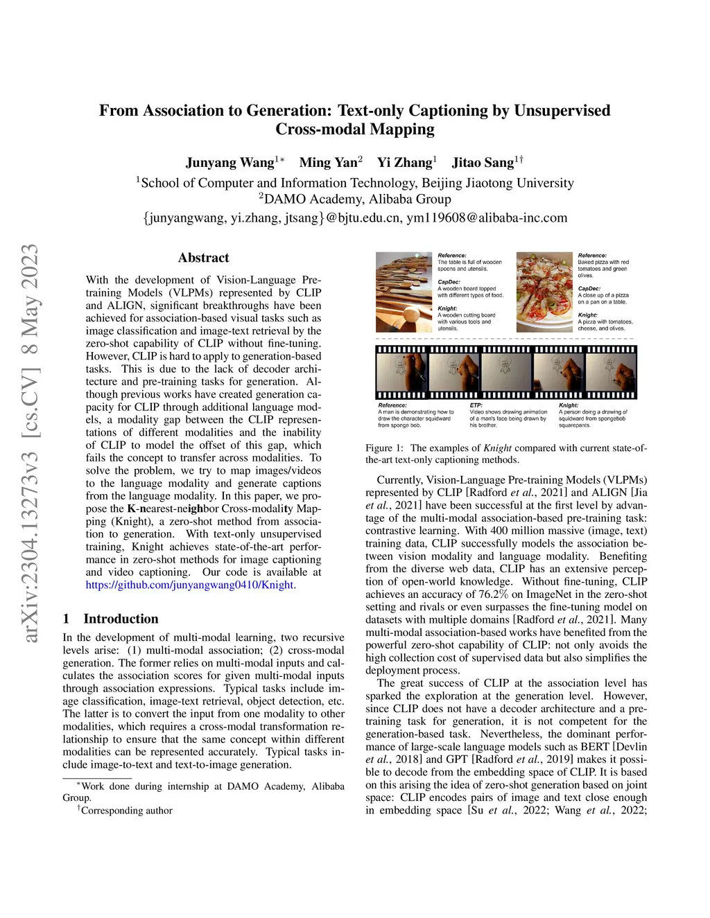 With the development of Vision-Language Pre-training Models (VLPMs) represented by CLIP and ALIGN, significant breakthroughs have been achieved for association-based visual tasks such as image classification and image-text retrieval by the zero-shot capability of CLIP without fine-tuning. However, CLIP is hard to apply to generation-based tasks. This is due to the lack of decoder architecture and pre-training tasks for generation. Although previous works have created generation capacity for CLIP through additional language models, a modality gap between the CLIP representations of different modalities and the inability of CLIP to model the offset of this gap, which fails the concept to transfer across modalities. To solve the problem, we try to map images/videos to the language modality and generate captions from the language modality. In this paper, we propose the K-nearest-neighbor Cross-modality Mapping (Knight), a zero-shot method from association to generation. With text-only unsupervised training, Knight achieves State-of-the-Art performance in zero-shot methods for image captioning and video captioning. Our code is available at https://github.com/junyangwang0410/Knight.