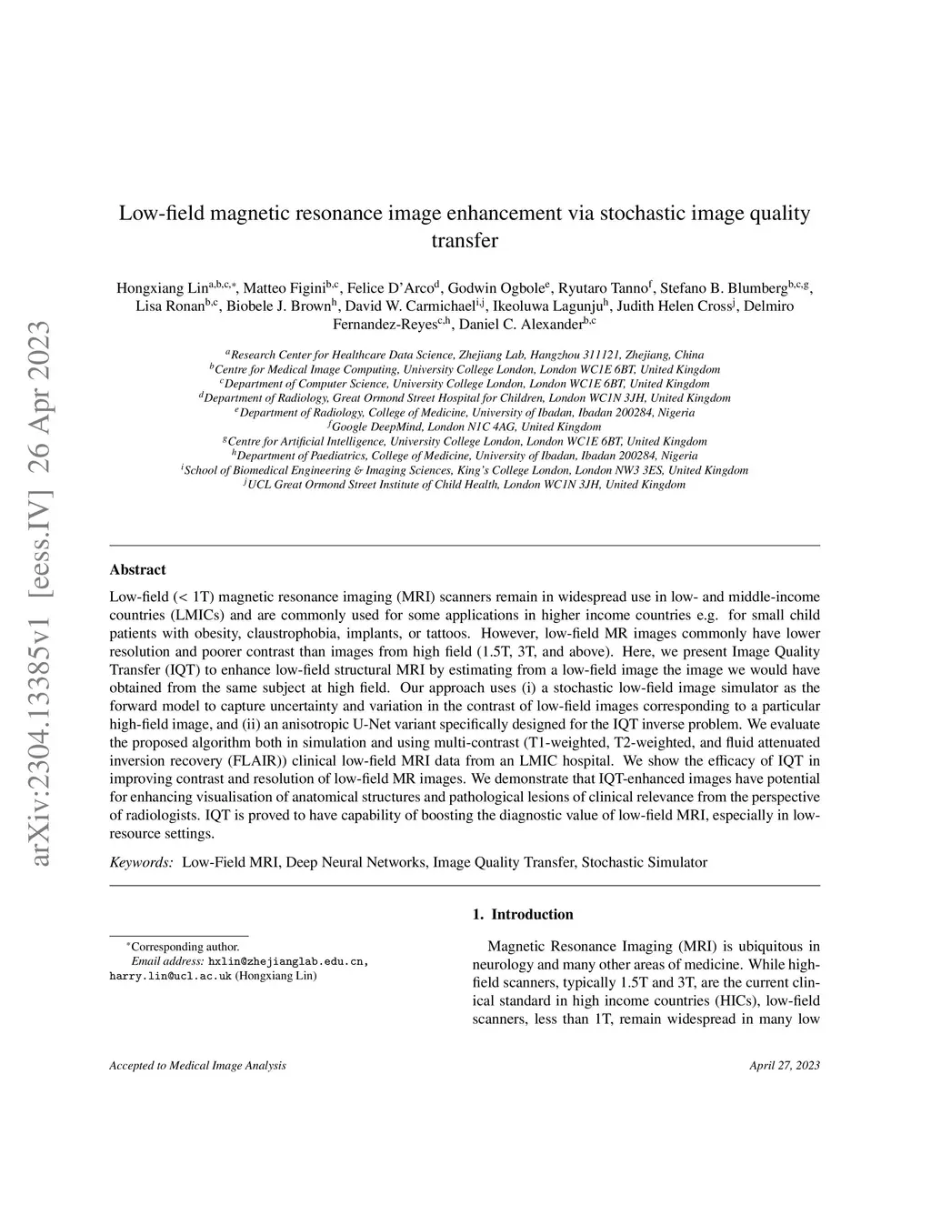 Low-field (<1T) magnetic resonance imaging (MRI) scanners remain in widespread use in low- and middle-income countries (LMICs) and are commonly used for some applications in higher income countries e.g. for small child patients with obesity, claustrophobia, implants, or tattoos. However, low-field MR images commonly have lower resolution and poorer contrast than images from high field (1.5T, 3T, and above). Here, we present Image Quality Transfer (IQT) to enhance low-field structural MRI by estimating from a low-field image the image we would have obtained from the same subject at high field. Our approach uses (i) a stochastic low-field image simulator as the forward model to capture uncertainty and variation in the contrast of low-field images corresponding to a particular high-field image, and (ii) an anisotropic U-Net variant specifically designed for the IQT inverse problem. We evaluate the proposed algorithm both in simulation and using multi-contrast (T1-weighted, T2-weighted, and fluid attenuated inversion recovery (FLAIR)) clinical low-field MRI data from an LMIC hospital. We show the efficacy of IQT in improving contrast and resolution of low-field MR images. We demonstrate that IQT-enhanced images have potential for enhancing visualisation of anatomical structures and pathological lesions of clinical relevance from the perspective of radiologists. IQT is proved to have capability of boosting the diagnostic value of low-field MRI, especially in low-resource settings.