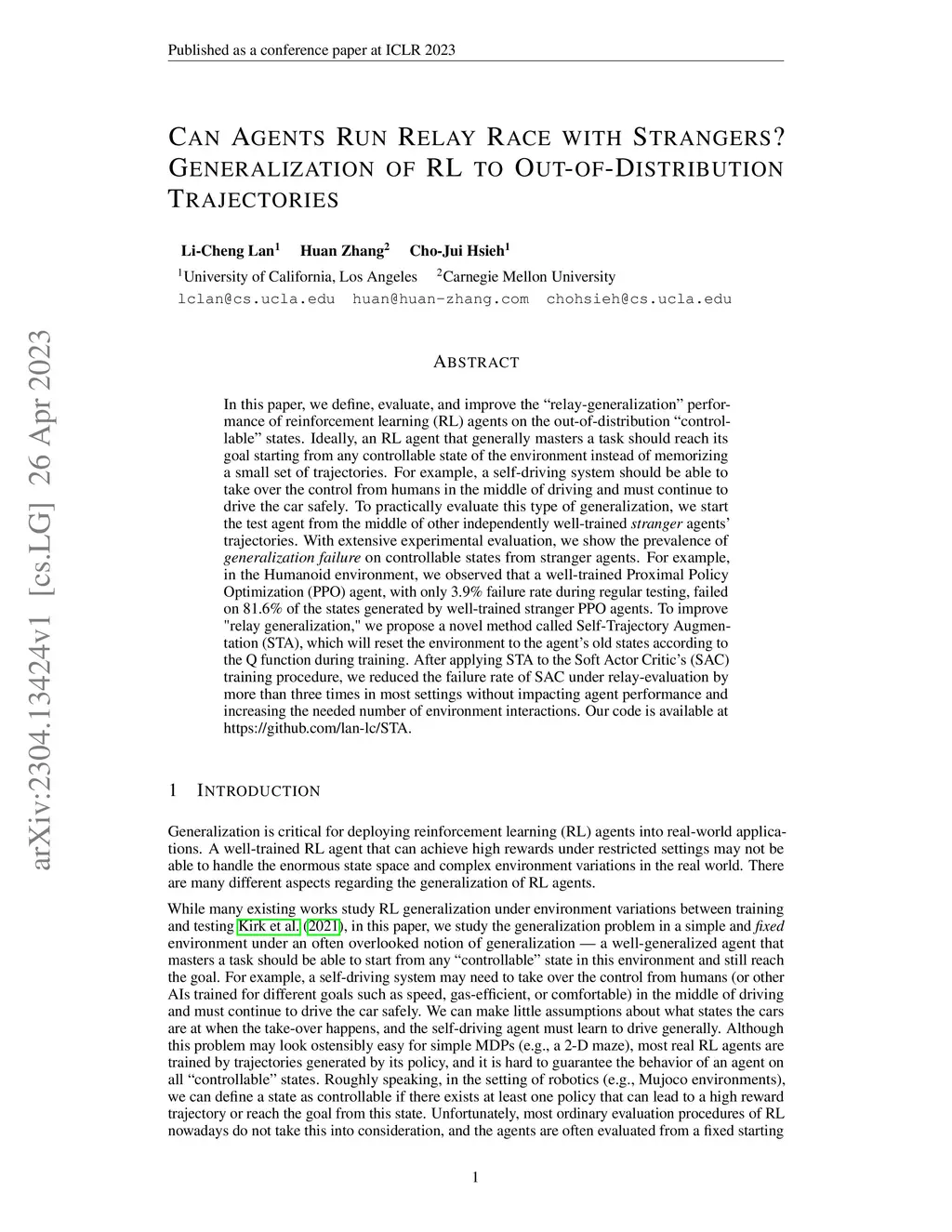In this paper, we define, evaluate, and improve the ``relay-generalization'' performance of reinforcement learning (RL) agents on the out-of-distribution ``controllable'' states. Ideally, an RL agent that generally masters a task should reach its goal starting from any controllable state of the environment instead of memorizing a small set of trajectories. For example, a self-driving system should be able to take over the control from humans in the middle of driving and must continue to drive the car safely. To practically evaluate this type of generalization, we start the test agent from the middle of other independently well-trained \emph{stranger} agents' trajectories. With extensive experimental evaluation, we show the prevalence of \emph{generalization failure} on controllable states from stranger agents. For example, in the Humanoid environment, we observed that a well-trained Proximal Policy Optimization (PPO) agent, with only 3.9\% failure rate during regular testing, failed on 81.6\% of the states generated by well-trained stranger PPO agents. To improve "relay generalization," we propose a novel method called Self-Trajectory Augmentation (STA), which will reset the environment to the agent's old states according to the Q function during training. After applying STA to the Soft Actor Critic's (SAC) training procedure, we reduced the failure rate of SAC under relay-evaluation by more than three times in most settings without impacting agent performance and increasing the needed number of environment interactions. Our code is available at https://github.com/lan-lc/STA.