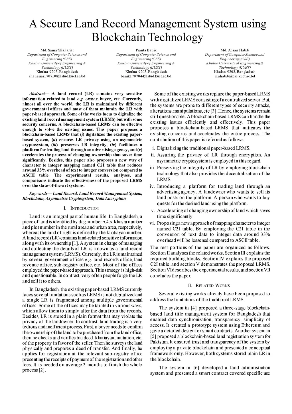 A land record (LR) contains very sensitive information related to land e.g. owner, buyer, etc. Currently, almost all over the world, the LR is maintained by different governmental offices and most of them maintain the LR with paper-based approach. Some of the works focus to digitalize the existing land record management system (LRMS) but with some security concerns. A blockchain-based LRMS can be effective enough to solve the existing issues. This paper proposes a blockchain-based LRMS that (i) digitalizes the existing paper-based system, (ii) ensures LR privacy using an asymmetric cryptosystem, (iii) preserves LR integrity, (iv) facilitates a platform for trading land through an advertising agency, and (v) accelerates the process of changing ownership that saves time significantly. Besides, this paper also proposes a new way of character to integer mapping named C2I table that reduces around 33% overhead of text to integer conversion compared to ASCII table. The experimental results, analyses, and comparisons indicate the effectiveness of the proposed LRMS over the state-of-the-art systems.