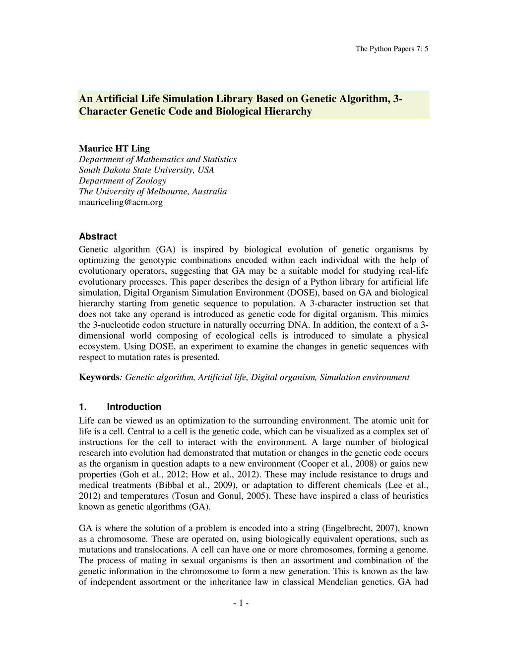 Genetic algorithm (GA) is inspired by biological evolution of genetic organisms by optimizing the genotypic combinations encoded within each individual with the help of evolutionary operators, suggesting that GA may be a suitable model for studying real-life evolutionary processes. This paper describes the design of a Python library for artificial life simulation, Digital Organism Simulation Environment (DOSE), based on GA and biological hierarchy starting from genetic sequence to population. A 3-character instruction set that does not take any operand is introduced as genetic code for digital organism. This mimics the 3-nucleotide codon structure in naturally occurring DNA. In addition, the context of a 3-dimensional world composing of ecological cells is introduced to simulate a physical ecosystem. Using DOSE, an experiment to examine the changes in genetic sequences with respect to mutation rates is presented.