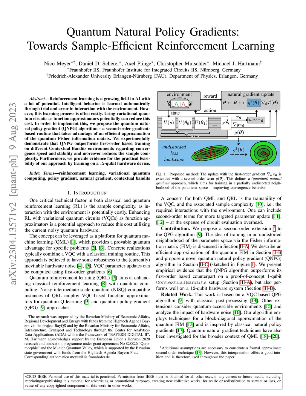 Reinforcement learning is a growing field in AI with a lot of potential. Intelligent behavior is learned automatically through trial and error in interaction with the environment. However, this learning process is often costly. Using variational quantum circuits as function approximators potentially can reduce this cost. In order to implement this, we propose the quantum natural policy gradient (QNPG) algorithm -- a second-order gradient-based routine that takes advantage of an efficient approximation of the quantum Fisher information matrix. We experimentally demonstrate that QNPG outperforms first-order based training on Contextual Bandits environments regarding convergence speed and stability and moreover reduces the sample complexity. Furthermore, we provide evidence for the practical feasibility of our approach by training on a 12-qubit hardware device.