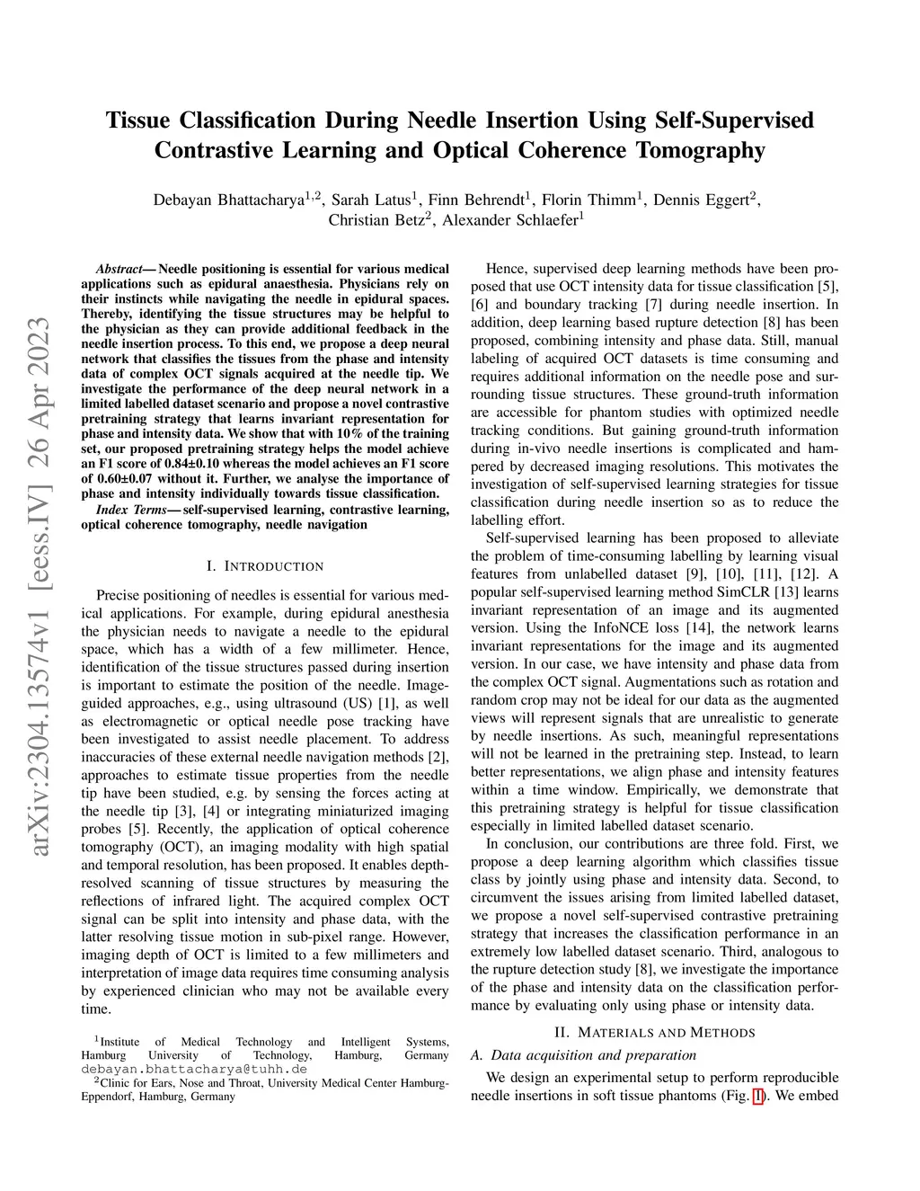 Needle positioning is essential for various medical applications such as epidural anaesthesia. Physicians rely on their instincts while navigating the needle in epidural spaces. Thereby, identifying the tissue structures may be helpful to the physician as they can provide additional feedback in the needle insertion process. To this end, we propose a deep neural network that classifies the tissues from the phase and intensity data of complex OCT signals acquired at the needle tip. We investigate the performance of the deep neural network in a limited labelled dataset scenario and propose a novel contrastive pretraining strategy that learns invariant representation for phase and intensity data. We show that with 10% of the training set, our proposed pretraining strategy helps the model achieve an F1 score of 0.84 whereas the model achieves an F1 score of 0.60 without it. Further, we analyse the importance of phase and intensity individually towards tissue classification.