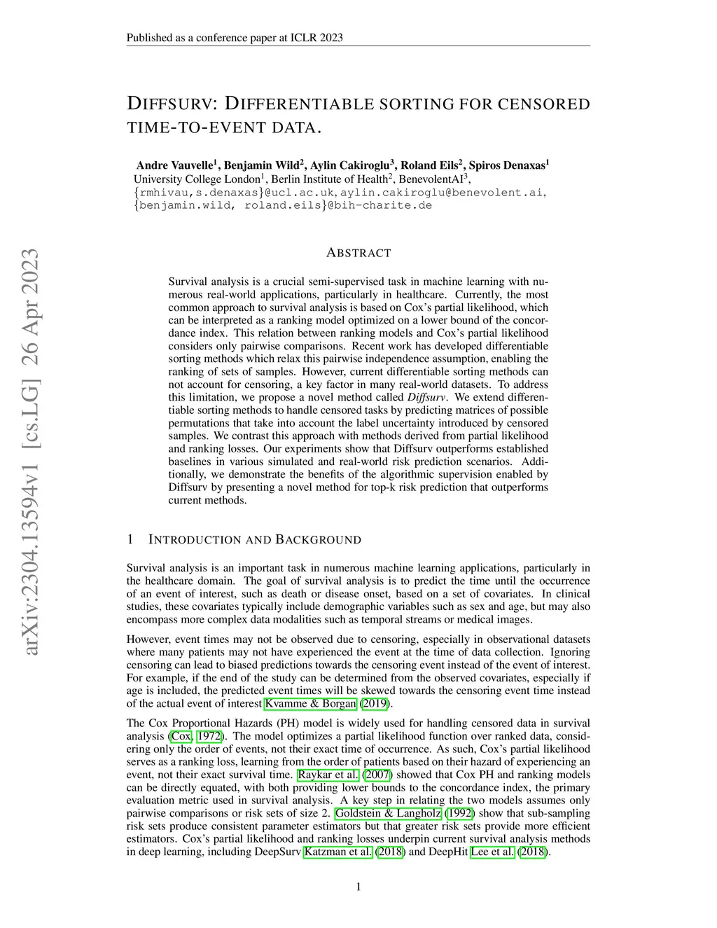 Survival analysis is a crucial semi-supervised task in machine learning with numerous real-world applications, particularly in healthcare. Currently, the most common approach to survival analysis is based on Cox's partial likelihood, which can be interpreted as a ranking model optimized on a lower bound of the concordance index. This relation between ranking models and Cox's partial likelihood considers only pairwise comparisons. Recent work has developed differentiable sorting methods which relax this pairwise independence assumption, enabling the ranking of sets of samples. However, current differentiable sorting methods cannot account for censoring, a key factor in many real-world datasets. To address this limitation, we propose a novel method called Diffsurv. We extend differentiable sorting methods to handle censored tasks by predicting matrices of possible permutations that take into account the label uncertainty introduced by censored samples. We contrast this approach with methods derived from partial likelihood and ranking losses. Our experiments show that Diffsurv outperforms established baselines in various simulated and real-world risk prediction scenarios. Additionally, we demonstrate the benefits of the algorithmic supervision enabled by Diffsurv by presenting a novel method for top-k risk prediction that outperforms current methods.