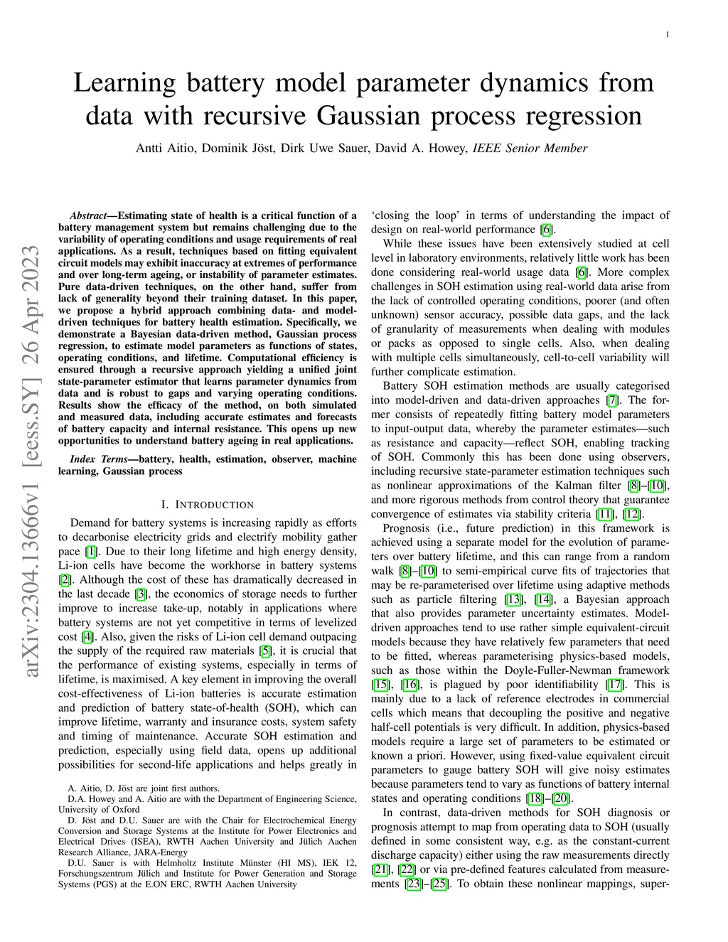 Estimating state of health is a critical function of a battery management system but remains challenging due to the variability of operating conditions and usage requirements of real applications. As a result, techniques based on fitting equivalent circuit models may exhibit inaccuracy at extremes of performance and over long-term ageing, or instability of parameter estimates. Pure data-driven techniques, on the other hand, suffer from lack of generality beyond their training dataset. In this paper, we propose a hybrid approach combining data- and model-driven techniques for battery health estimation. Specifically, we demonstrate a Bayesian data-driven method, Gaussian process regression, to estimate model parameters as functions of states, operating conditions, and lifetime. Computational efficiency is ensured through a recursive approach yielding a unified joint state-parameter estimator that learns parameter dynamics from data and is robust to gaps and varying operating conditions. Results show the efficacy of the method, on both simulated and measured data, including accurate estimates and forecasts of battery capacity and internal resistance. This opens up new opportunities to understand battery ageing in real applications.