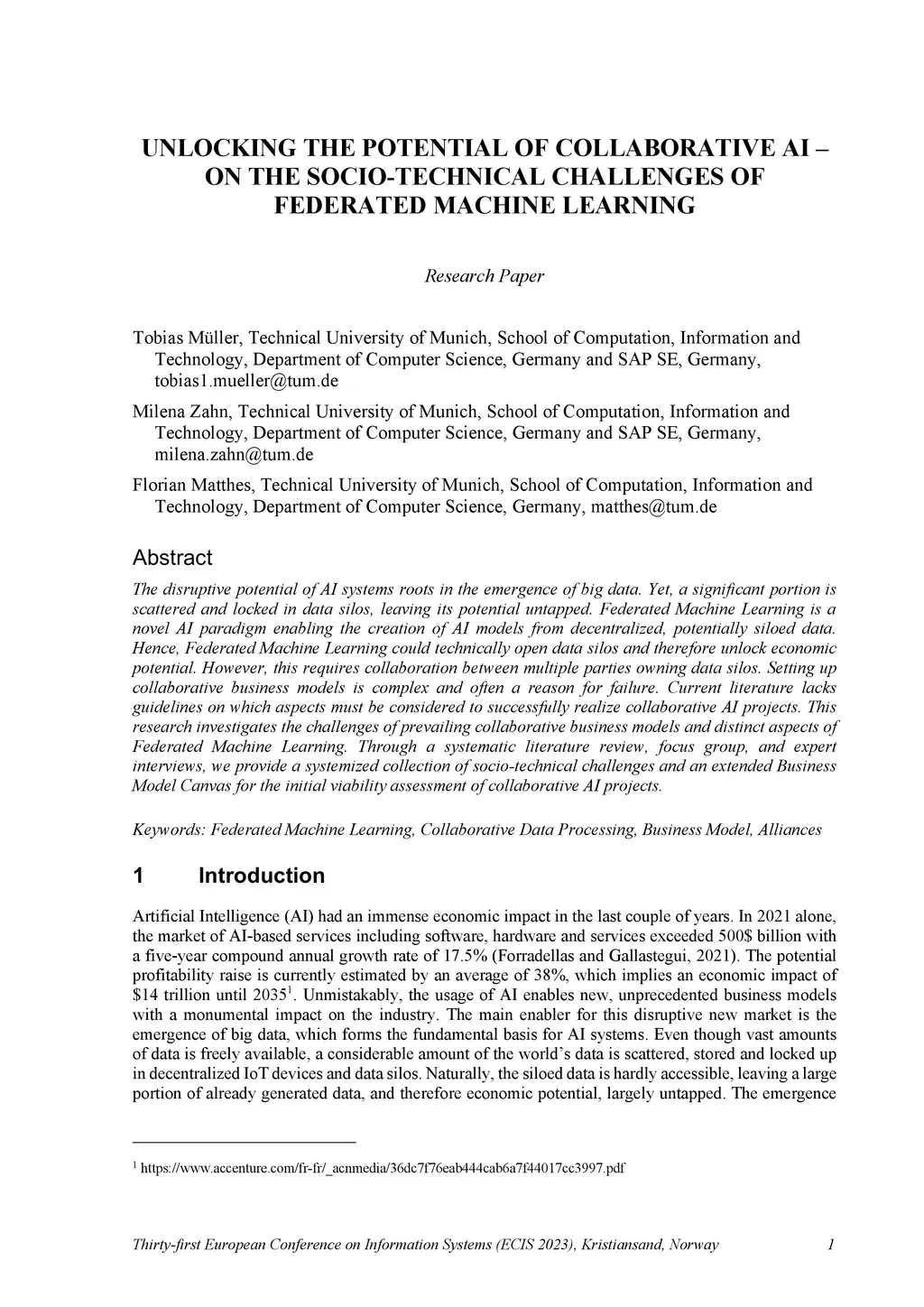 The disruptive potential of AI systems roots in the emergence of big data. Yet, a significant portion is scattered and locked in data silos, leaving its potential untapped. Federated Machine Learning is a novel AI paradigm enabling the creation of AI models from decentralized, potentially siloed data. Hence, Federated Machine Learning could technically open data silos and therefore unlock economic potential. However, this requires collaboration between multiple parties owning data silos. Setting up collaborative business models is complex and often a reason for failure. Current literature lacks guidelines on which aspects must be considered to successfully realize collaborative AI projects. This research investigates the challenges of prevailing collaborative business models and distinct aspects of Federated Machine Learning. Through a systematic literature review, focus group, and expert interviews, we provide a systemized collection of socio-technical challenges and an extended Business Model Canvas for the initial viability assessment of collaborative AI projects.