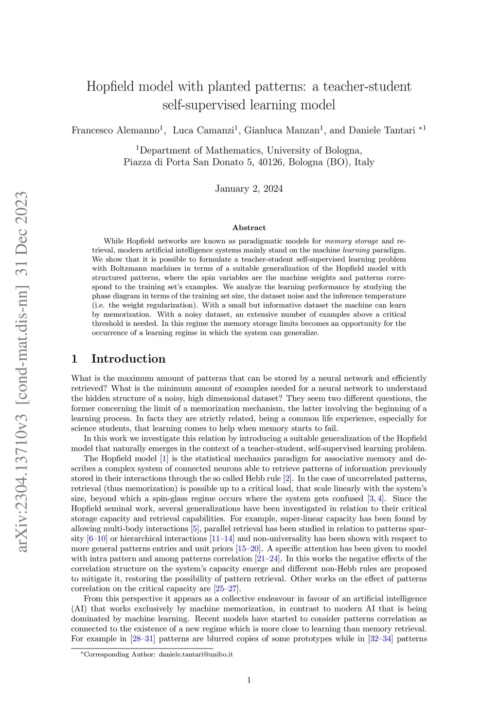 While Hopfield networks are known as paradigmatic models for memory storage and retrieval, modern artificial intelligence systems mainly stand on the machine learning paradigm. We show that it is possible to formulate a teacher-student self-supervised learning problem with Boltzmann machines in terms of a suitable generalization of the Hopfield model with structured patterns, where the spin variables are the machine weights and patterns correspond to the training set's examples. We analyze the learning performance by studying the phase diagram in terms of the training set size, the dataset noise and the inference temperature (i.e. the weight regularization). With a small but informative dataset the machine can learn by memorization. With a noisy dataset, an extensive number of examples above a critical threshold is needed. In this regime the memory storage limits of the system becomes an opportunity for the occurrence of a learning regime in which the system can generalize.