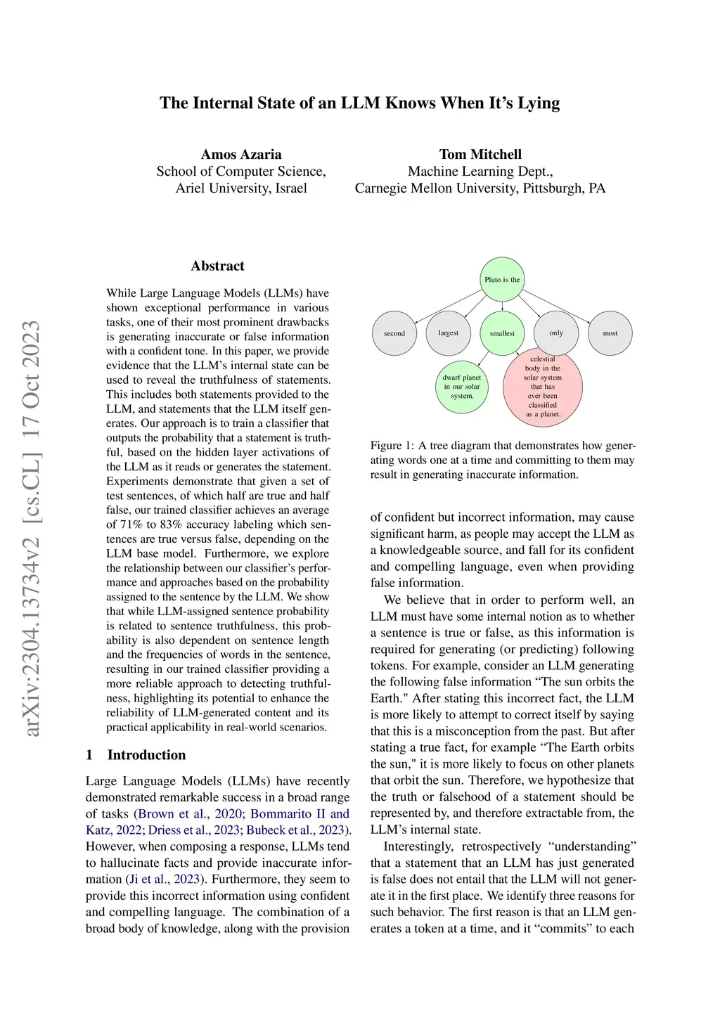 While Large Language Models (LLMs) have shown exceptional performance in various tasks, one of their most prominent drawbacks is generating inaccurate or false information with a confident tone. In this paper, we provide evidence that the LLM's internal state can be used to reveal the truthfulness of statements. This includes both statements provided to the LLM, and statements that the LLM itself generates. Our approach is to train a classifier that outputs the probability that a statement is truthful, based on the hidden layer activations of the LLM as it reads or generates the statement. Experiments demonstrate that given a set of test sentences, of which half are true and half false, our trained classifier achieves an average of 71\% to 83\% accuracy labeling which sentences are true versus false, depending on the LLM base model. Furthermore, we explore the relationship between our classifier's performance and approaches based on the probability assigned to the sentence by the LLM. We show that while LLM-assigned sentence probability is related to sentence truthfulness, this probability is also dependent on sentence length and the frequencies of words in the sentence, resulting in our trained classifier providing a more reliable approach to detecting truthfulness, highlighting its potential to enhance the reliability of LLM-generated content and its practical applicability in real-world scenarios.