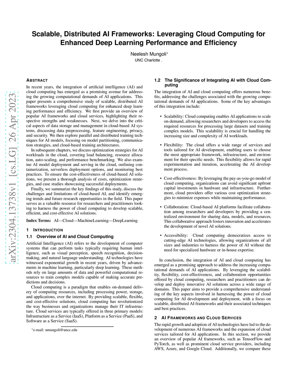 In recent years, the integration of artificial intelligence (AI) and cloud computing has emerged as a promising avenue for addressing the growing computational demands of AI applications. This paper presents a comprehensive study of scalable, distributed AI frameworks leveraging cloud computing for enhanced deep learning performance and efficiency. We first provide an overview of popular AI frameworks and cloud services, highlighting their respective strengths and weaknesses. Next, we delve into the critical aspects of data storage and management in cloud-based AI systems, discussing data preprocessing, feature engineering, privacy, and security. We then explore parallel and distributed training techniques for AI models, focusing on model partitioning, communication strategies, and cloud-based training architectures. In subsequent chapters, we discuss optimization strategies for AI workloads in the cloud, covering load balancing, resource allocation, auto-scaling, and performance benchmarking. We also examine AI model deployment and serving in the cloud, outlining containerization, serverless deployment options, and monitoring best practices. To ensure the cost-effectiveness of cloud-based AI solutions, we present a thorough analysis of costs, optimization strategies, and case studies showcasing successful deployments. Finally, we summarize the key findings of this study, discuss the challenges and limitations of cloud-based AI, and identify emerging trends and future research opportunities in the field.