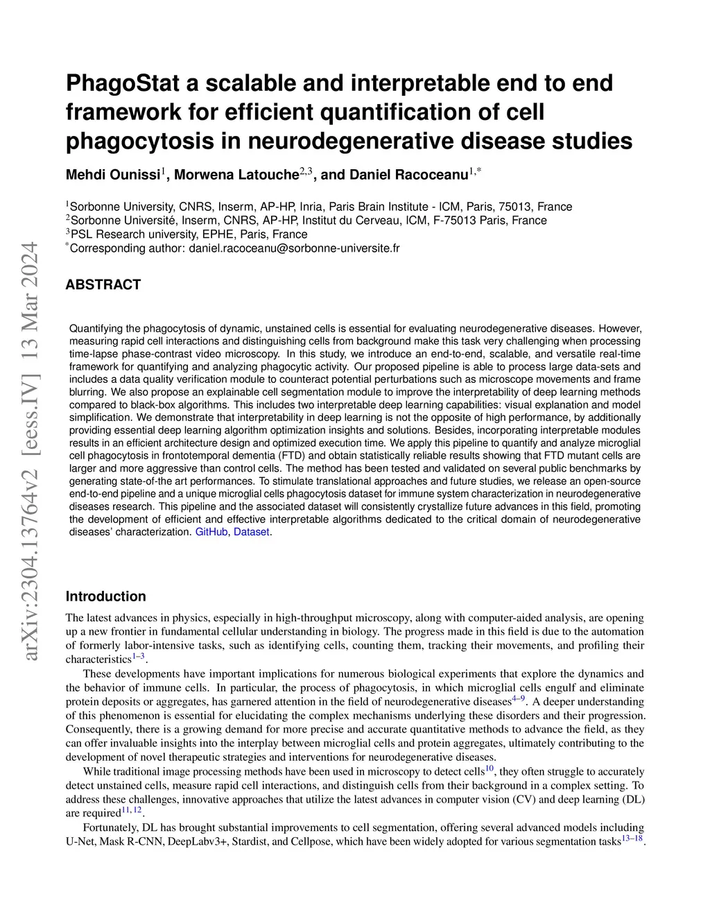 Quantifying the phagocytosis of dynamic, unstained cells is essential for evaluating neurodegenerative diseases. However, measuring rapid cell interactions and distinguishing cells from background make this task very challenging when processing time-lapse phase-contrast video microscopy. In this study, we introduce an end-to-end, scalable, and versatile real-time framework for quantifying and analyzing phagocytic activity. Our proposed pipeline is able to process large data-sets and includes a data quality verification module to counteract perturbations such as microscope movements and frame blurring. We also propose an explainable cell segmentation module to improve the interpretability of DL methods compared to black-box algorithms. This includes two interpretable DL capabilities: visual explanation and model simplification. We demonstrate that interpretability in DL is not the opposite of high performance, by additionally providing essential DL algorithm optimization insights and solutions. Besides, incorporating interpretable modules results in an efficient architecture design and optimized execution time. We apply our pipeline to analyze microglial cell phagocytosis in FTD and obtain statistically reliable results showing that FTD mutant cells are larger and more aggressive than control cells. The method has been tested and validated on public benchmarks by generating state-of-the art performances. To stimulate translational approaches and future studies, we release an open-source end-to-end pipeline and a unique microglial cells phagocytosis dataset for immune system characterization in neurodegenerative diseases research. This pipeline and the associated dataset will consistently crystallize future advances in this field, promoting the development of interpretable algorithms dedicated to the domain of neurodegenerative diseases' characterization. github.com/ounissimehdi/PhagoStat