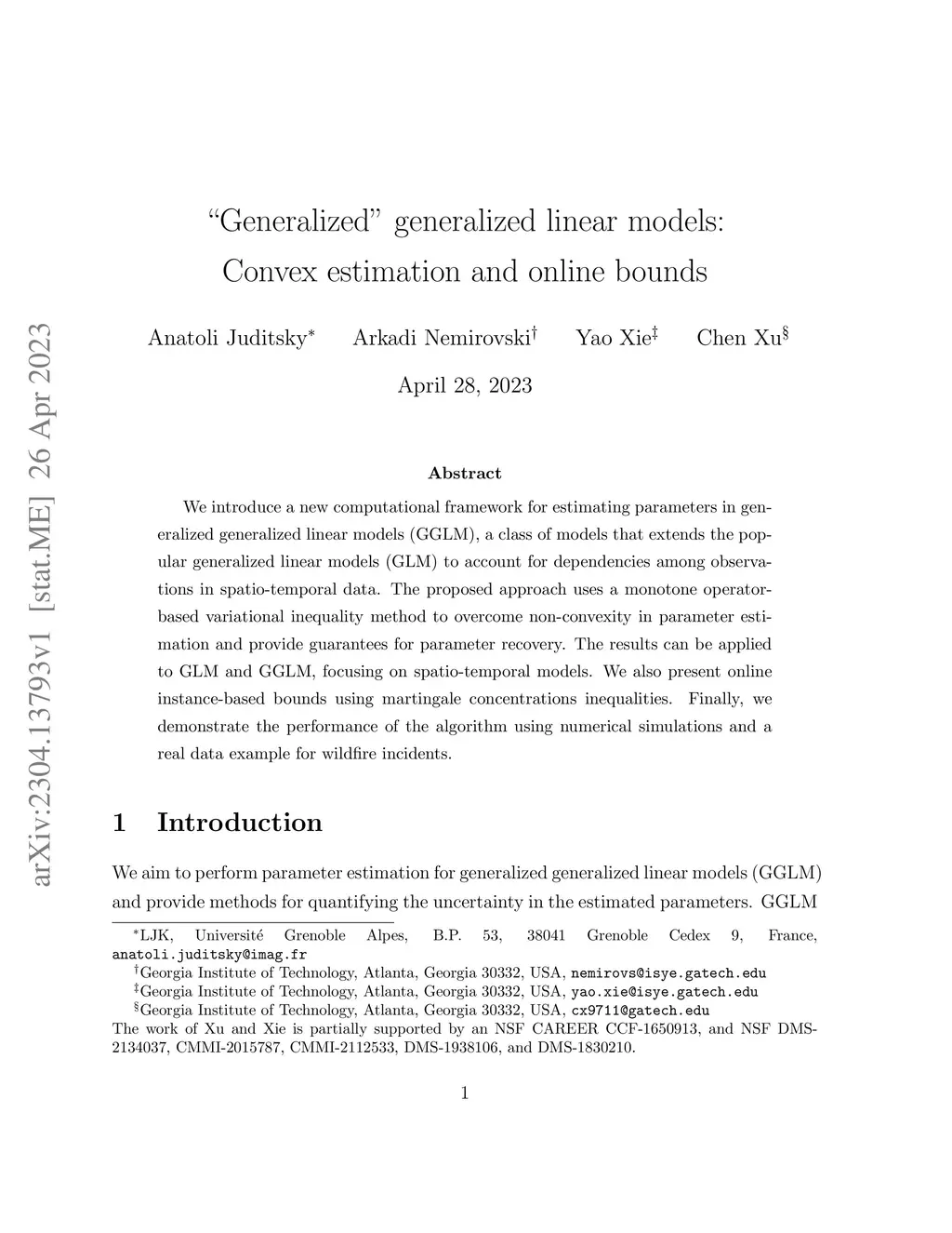 We introduce a new computational framework for estimating parameters in generalized generalized linear models (GGLM), a class of models that extends the popular generalized linear models (GLM) to account for dependencies among observations in spatio-temporal data. The proposed approach uses a monotone operator-based variational inequality method to overcome non-convexity in parameter estimation and provide guarantees for parameter recovery. The results can be applied to GLM and GGLM, focusing on spatio-temporal models. We also present online instance-based bounds using martingale concentrations inequalities. Finally, we demonstrate the performance of the algorithm using numerical simulations and a real data example for wildfire incidents.