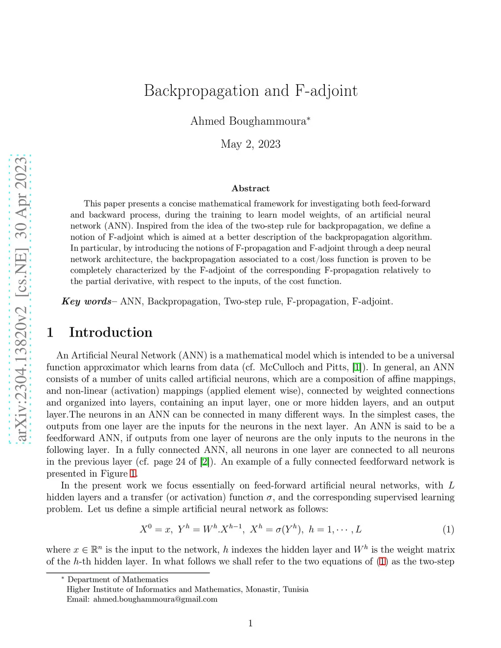 This paper presents a concise mathematical framework for investigating both feed-forward and backward process, during the training to learn model weights, of an artificial neural network (ANN). Inspired from the idea of the two-step rule for backpropagation, we define a notion of F-adjoint which is aimed at a better description of the backpropagation algorithm. In particular, by introducing the notions of F-propagation and F-adjoint through a deep neural network architecture, the backpropagation associated to a cost/loss function is proven to be completely characterized by the F-adjoint of the corresponding F-propagation relatively to the partial derivative, with respect to the inputs, of the cost function.