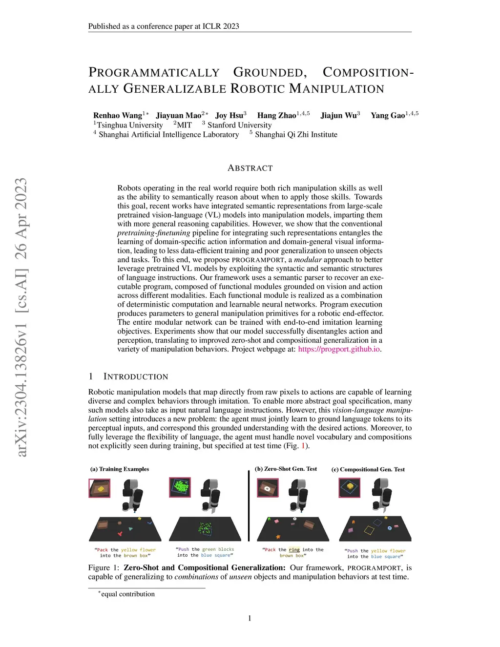Robots operating in the real world require both rich manipulation skills as well as the ability to semantically reason about when to apply those skills. Towards this goal, recent works have integrated semantic representations from large-scale pretrained vision-language (VL) models into manipulation models, imparting them with more general reasoning capabilities. However, we show that the conventional pretraining-finetuning pipeline for integrating such representations entangles the learning of domain-specific action information and domain-general visual information, leading to less data-efficient training and poor generalization to unseen objects and tasks. To this end, we propose ProgramPort, a modular approach to better leverage pretrained VL models by exploiting the syntactic and semantic structures of language instructions. Our framework uses a semantic parser to recover an executable program, composed of functional modules grounded on vision and action across different modalities. Each functional module is realized as a combination of deterministic computation and learnable neural networks. Program execution produces parameters to general manipulation primitives for a robotic end-effector. The entire modular network can be trained with end-to-end imitation learning objectives. Experiments show that our model successfully disentangles action and perception, translating to improved zero-shot and compositional generalization in a variety of manipulation behaviors. Project webpage at: \url{https://progport.github.io}.