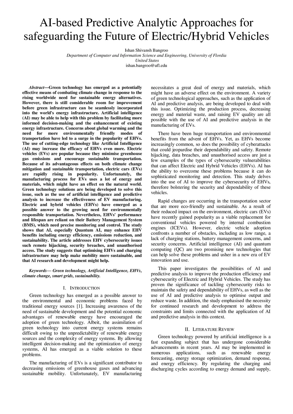 In response to the global need for sustainable energy, green technology may help fight climate change. Before green infrastructure to be easily integrated into the world's energy system, it needs upgrading. By improving energy infrastructure and decision-making, artificial intelligence (AI) may help solve this challenge. EHVs have grown in popularity because to concerns about global warming and the need for more ecologically friendly transportation. EHVs may work better with cutting-edge technologies like AI. Electric vehicles (EVs) reduce greenhouse gas emissions and promote sustainable mobility. Electric automobiles (EVs) are growing in popularity due to their benefits for climate change mitigation and sustainable mobility. Unfortunately, EV production consumes a lot of energy and materials, which may harm nature. EV production is being improved using green technologies like artificial intelligence and predictive analysis. Electric and hybrid vehicles (EHVs) may help meet the need for ecologically friendly transportation. However, the Battery Management System (BMS) controls EHV performance and longevity. AI may improve EHV energy efficiency, emissions reduction, and sustainability. Remote hijacking, security breaches, and unauthorized access are EHV cybersecurity vulnerabilities addressed in the article. AI research and development may help make transportation more sustainable, as may optimizing EHVs and charging infrastructure.
