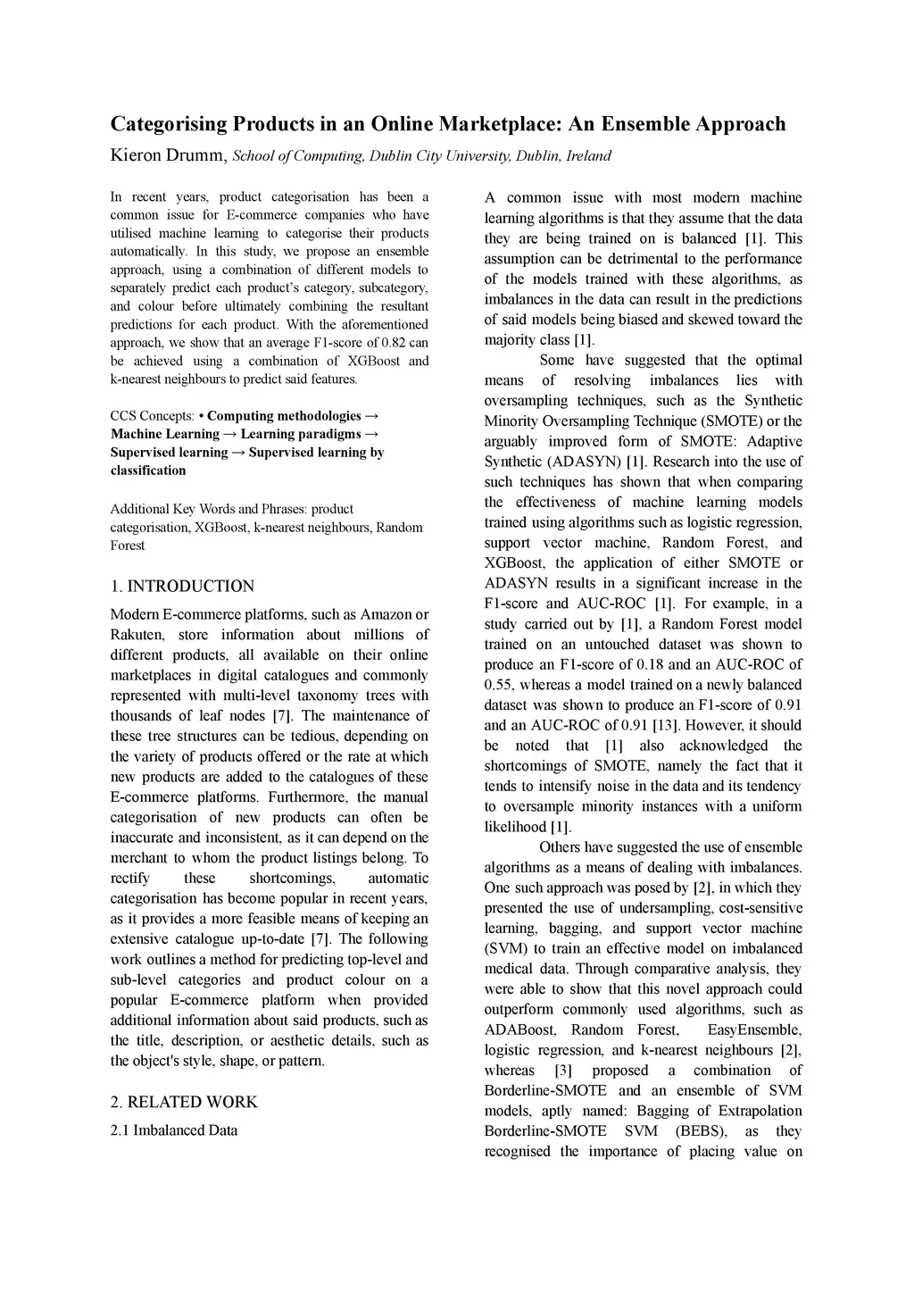 In recent years, product categorisation has been a common issue for E-commerce companies who have utilised machine learning to categorise their products automatically. In this study, we propose an ensemble approach, using a combination of different models to separately predict each product's category, subcategory, and colour before ultimately combining the resultant predictions for each product. With the aforementioned approach, we show that an average F1-score of 0.82 can be achieved using a combination of XGBoost and k-nearest neighbours to predict said features.