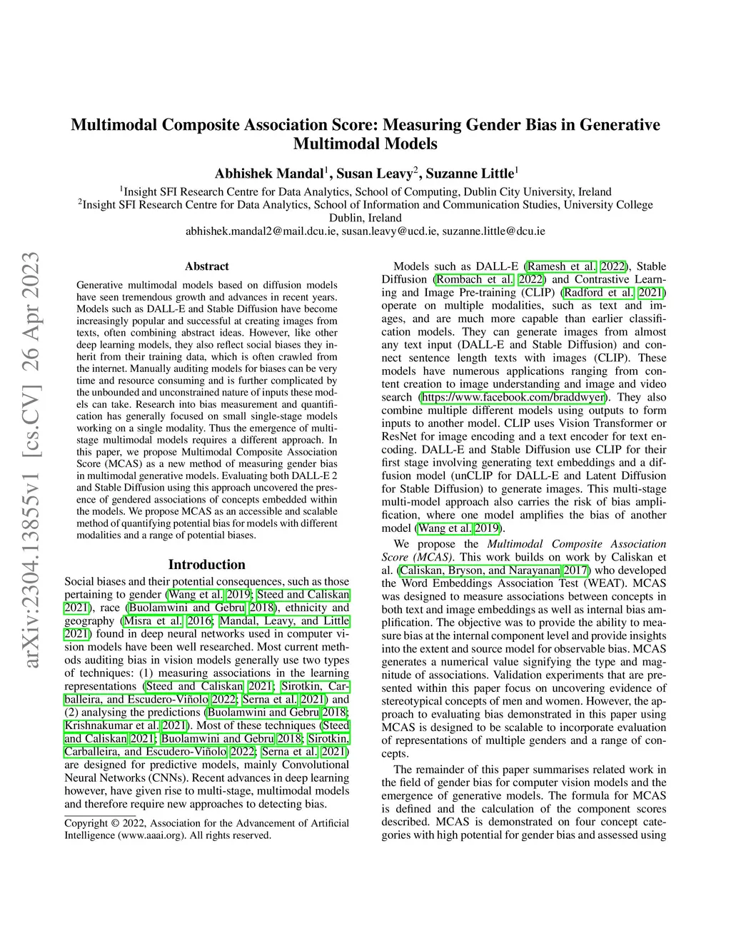 Generative multimodal models based on diffusion models have seen tremendous growth and advances in recent years. Models such as DALL-E and Stable Diffusion have become increasingly popular and successful at creating images from texts, often combining abstract ideas. However, like other deep learning models, they also reflect social biases they inherit from their training data, which is often crawled from the internet. Manually auditing models for biases can be very time and resource consuming and is further complicated by the unbounded and unconstrained nature of inputs these models can take. Research into bias measurement and quantification has generally focused on small single-stage models working on a single modality. Thus the emergence of multistage multimodal models requires a different approach. In this paper, we propose Multimodal Composite Association Score (MCAS) as a new method of measuring gender bias in multimodal generative models. Evaluating both DALL-E 2 and Stable Diffusion using this approach uncovered the presence of gendered associations of concepts embedded within the models. We propose MCAS as an accessible and scalable method of quantifying potential bias for models with different modalities and a range of potential biases.