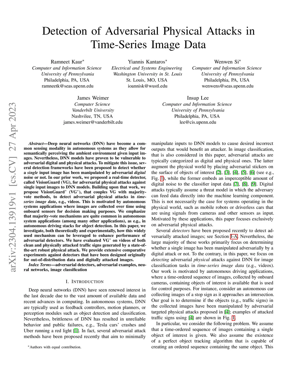 Deep neural networks (DNN) have become a common sensing modality in autonomous systems as they allow for semantically perceiving the ambient environment given input images. Nevertheless, DNN models have proven to be vulnerable to adversarial digital and physical attacks. To mitigate this issue, several detection frameworks have been proposed to detect whether a single input image has been manipulated by adversarial digital noise or not. In our prior work, we proposed a real-time detector, called VisionGuard (VG), for adversarial physical attacks against single input images to DNN models. Building upon that work, we propose VisionGuard* (VG), which couples VG with majority-vote methods, to detect adversarial physical attacks in time-series image data, e.g., videos. This is motivated by autonomous systems applications where images are collected over time using onboard sensors for decision-making purposes. We emphasize that majority-vote mechanisms are quite common in autonomous system applications (among many other applications), as e.g., in autonomous driving stacks for object detection. In this paper, we investigate, both theoretically and experimentally, how this widely used mechanism can be leveraged to enhance the performance of adversarial detectors. We have evaluated VG* on videos of both clean and physically attacked traffic signs generated by a state-of-the-art robust physical attack. We provide extensive comparative experiments against detectors that have been designed originally for out-of-distribution data and digitally attacked images.