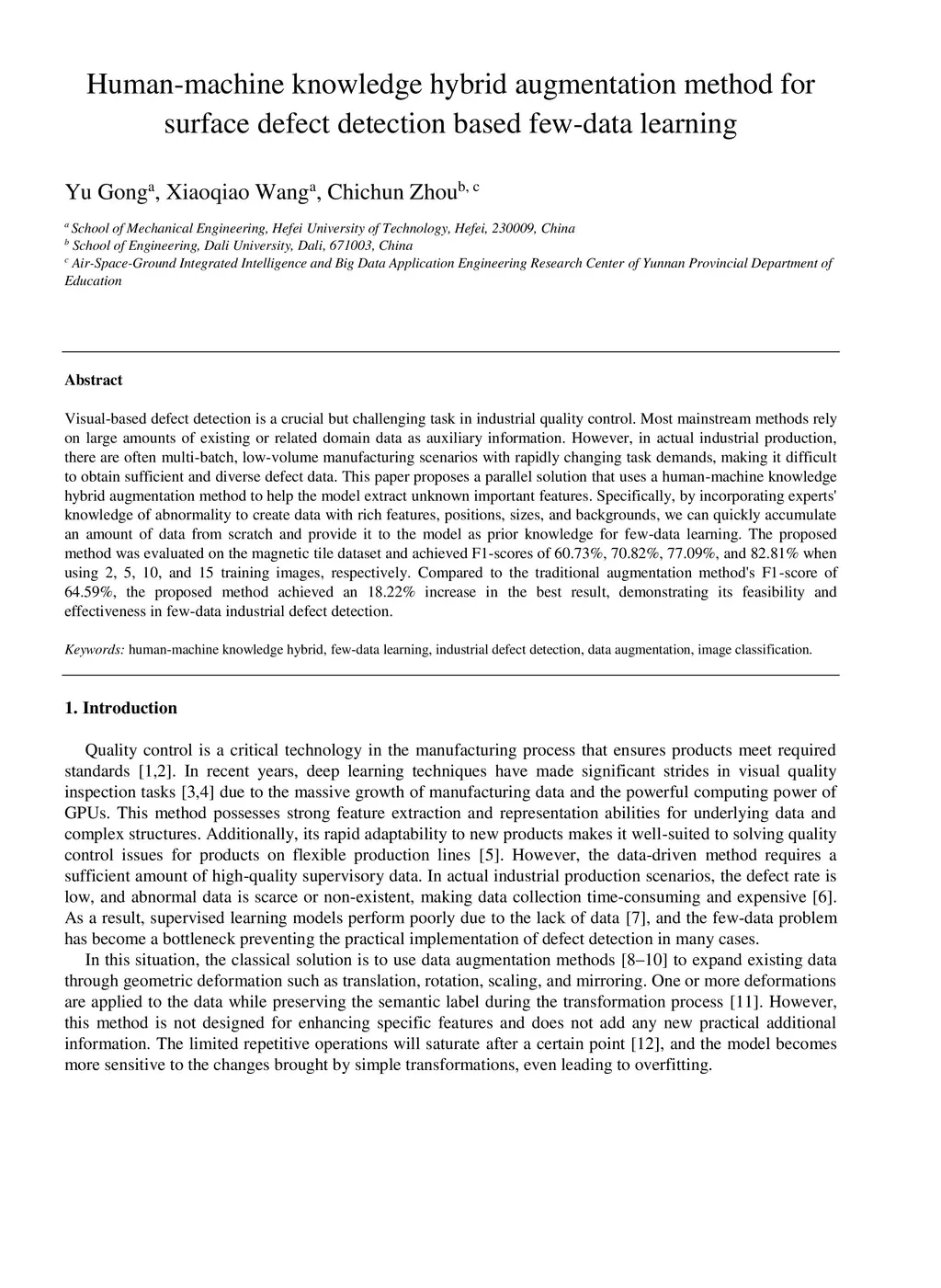 Visual-based defect detection is a crucial but challenging task in industrial quality control. Most mainstream methods rely on large amounts of existing or related domain data as auxiliary information. However, in actual industrial production, there are often multi-batch, low-volume manufacturing scenarios with rapidly changing task demands, making it difficult to obtain sufficient and diverse defect data. This paper proposes a parallel solution that uses a human-machine knowledge hybrid augmentation method to help the model extract unknown important features. Specifically, by incorporating experts' knowledge of abnormality to create data with rich features, positions, sizes, and backgrounds, we can quickly accumulate an amount of data from scratch and provide it to the model as prior knowledge for few-data learning. The proposed method was evaluated on the magnetic tile dataset and achieved F1-scores of 60.73%, 70.82%, 77.09%, and 82.81% when using 2, 5, 10, and 15 training images, respectively. Compared to the traditional augmentation method's F1-score of 64.59%, the proposed method achieved an 18.22% increase in the best result, demonstrating its feasibility and effectiveness in few-data industrial defect detection.