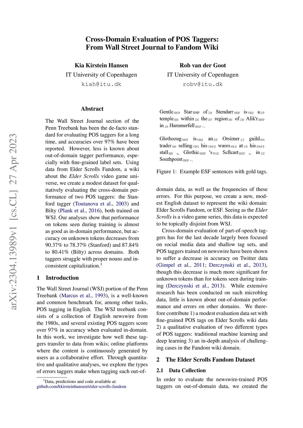 The Wall Street Journal section of the Penn Treebank has been the de-facto standard for evaluating POS taggers for a long time, and accuracies over 97\% have been reported. However, less is known about out-of-domain tagger performance, especially with fine-grained label sets. Using data from Elder Scrolls Fandom, a wiki about the \textit{Elder Scrolls} video game universe, we create a modest dataset for qualitatively evaluating the cross-domain performance of two POS taggers: the Stanford tagger (Toutanova et al. 2003) and Bilty (Plank et al. 2016), both trained on WSJ. Our analyses show that performance on tokens seen during training is almost as good as in-domain performance, but accuracy on unknown tokens decreases from 90.37% to 78.37% (Stanford) and 87.84\% to 80.41\% (Bilty) across domains. Both taggers struggle with proper nouns and inconsistent capitalization.