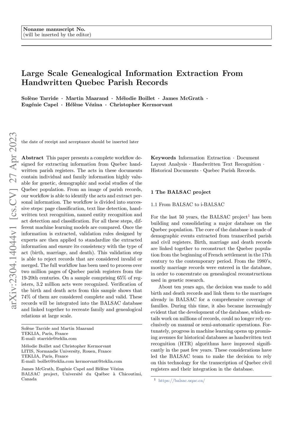 Large Scale Genealogical Information Extraction From Handwritten Quebec