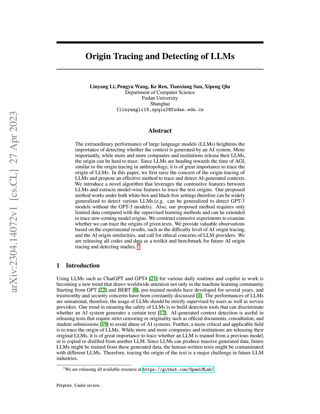 The extraordinary performance of large language models (LLMs) heightens the importance of detecting whether the context is generated by an AI system. More importantly, while more and more companies and institutions release their LLMs, the origin can be hard to trace. Since LLMs are heading towards the time of AGI, similar to the origin tracing in anthropology, it is of great importance to trace the origin of LLMs. In this paper, we first raise the concern of the origin tracing of LLMs and propose an effective method to trace and detect AI-generated contexts. We introduce a novel algorithm that leverages the contrastive features between LLMs and extracts model-wise features to trace the text origins. Our proposed method works under both white-box and black-box settings therefore can be widely generalized to detect various LLMs.(e.g. can be generalized to detect GPT-3 models without the GPT-3 models). Also, our proposed method requires only limited data compared with the supervised learning methods and can be extended to trace new-coming model origins. We construct extensive experiments to examine whether we can trace the origins of given texts. We provide valuable observations based on the experimental results, such as the difficulty level of AI origin tracing, and the AI origin similarities, and call for ethical concerns of LLM providers. We are releasing all codes and data as a toolkit and benchmark for future AI origin tracing and detecting studies. \footnote{We are releasing all available resource at \url{https://github.com/OpenLMLab/}.}