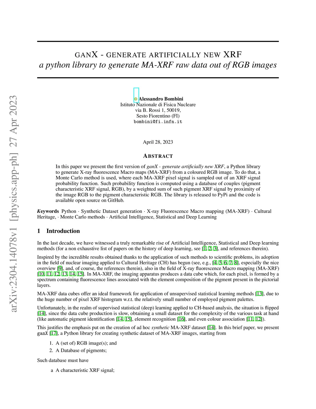In this paper we present the first version of ganX -- generate artificially new XRF, a Python library to generate X-ray fluorescence Macro maps (MA-XRF) from a coloured RGB image. To do that, a Monte Carlo method is used, where each MA-XRF pixel signal is sampled out of an XRF signal probability function. Such probability function is computed using a database of couples (pigment characteristic XRF signal, RGB), by a weighted sum of such pigment XRF signal by proximity of the image RGB to the pigment characteristic RGB. The library is released to PyPi and the code is available open source on GitHub.