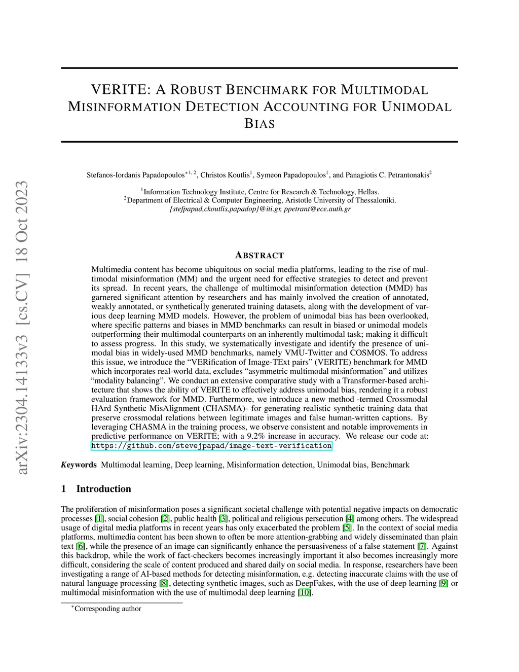 Multimedia content has become ubiquitous on social media platforms, leading to the rise of multimodal misinformation (MM) and the urgent need for effective strategies to detect and prevent its spread. In recent years, the challenge of multimodal misinformation detection (MMD) has garnered significant attention by researchers and has mainly involved the creation of annotated, weakly annotated, or synthetically generated training datasets, along with the development of various deep learning MMD models. However, the problem of unimodal bias has been overlooked, where specific patterns and biases in MMD benchmarks can result in biased or unimodal models outperforming their multimodal counterparts on an inherently multimodal task; making it difficult to assess progress. In this study, we systematically investigate and identify the presence of unimodal bias in widely-used MMD benchmarks, namely VMU-Twitter and COSMOS. To address this issue, we introduce the "VERification of Image-TExt pairs" (VERITE) benchmark for MMD which incorporates real-world data, excludes "asymmetric multimodal misinformation" and utilizes "modality balancing". We conduct an extensive comparative study with a Transformer-based architecture that shows the ability of VERITE to effectively address unimodal bias, rendering it a robust evaluation framework for MMD. Furthermore, we introduce a new method -- termed Crossmodal HArd Synthetic MisAlignment (CHASMA) -- for generating realistic synthetic training data that preserve crossmodal relations between legitimate images and false human-written captions. By leveraging CHASMA in the training process, we observe consistent and notable improvements in predictive performance on VERITE; with a 9.2% increase in accuracy. We release our code at: https://github.com/stevejpapad/image-text-verification